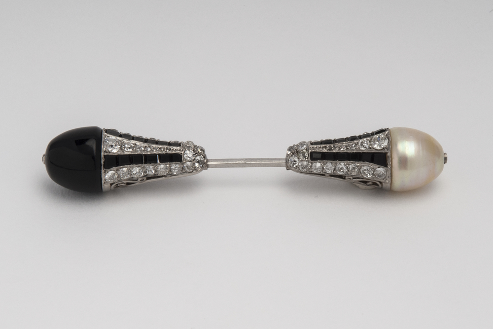 Lotto 340 | JABOT PIN IN PLATINO, ONICE, PERLA E DIAMANTI Francia, Art Deco Marchi...