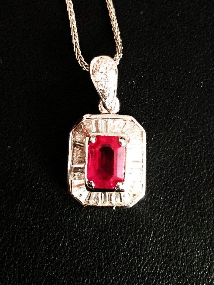 PENDENTE IN ORO BIANCO, RUBINO E DIAMANTI decorato con rubino del peso...