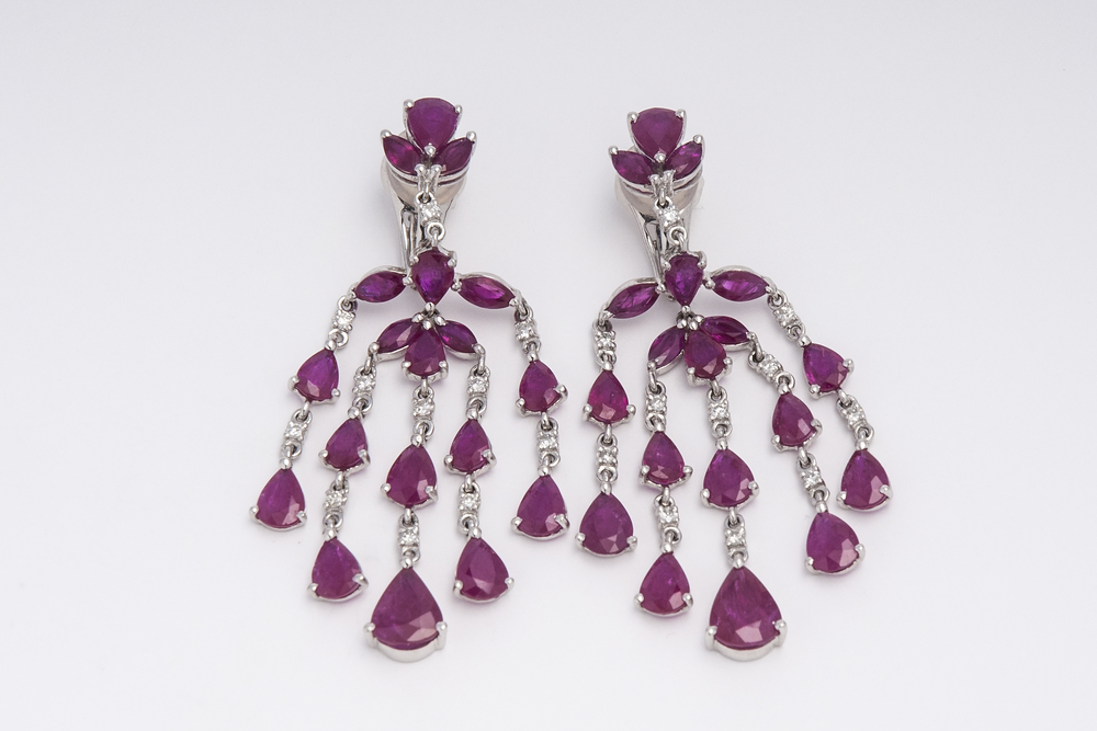 ORECCHINI PENDENTI IN ORO BIANCO, RUBINI E DIAMANTI decorati con rubini del peso stimato di carati 19, e da diamanti taglio brillante del peso stimato di carati 0,50, Peso 17,20 A WHITE GOLD, RUBY AND DIAMOND EAR PENDANTS