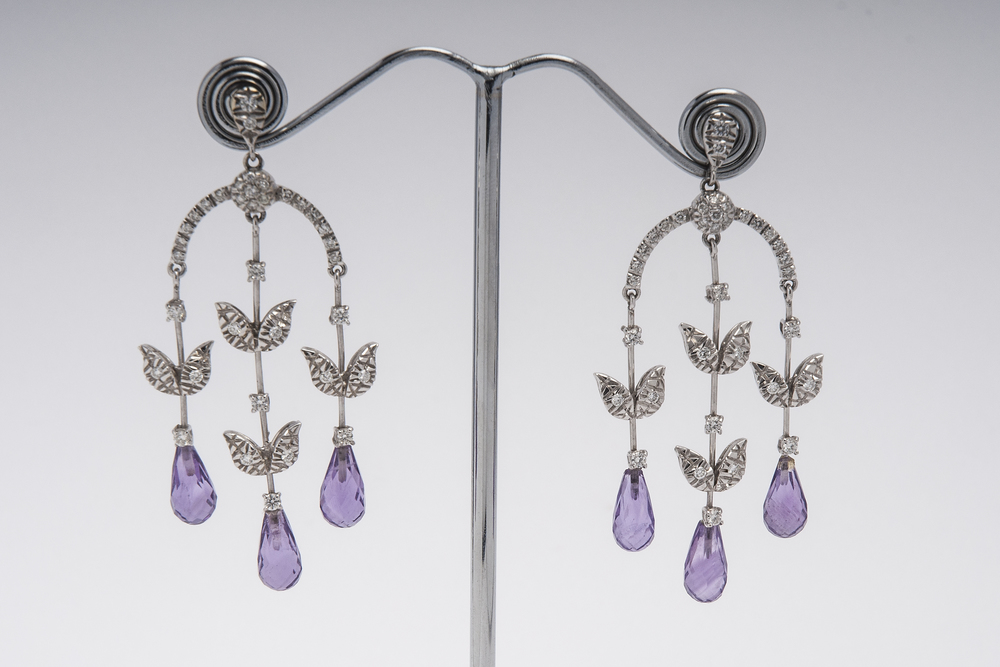 ORECCHINI PENDENTI IN ORO BIANCO, AMETISTE E DIAMANTI a motivo fogliaceo, decorati con 6 gocce in ametista con taglio briolette, e diamanti taglio brillante di ct 0,50 ca, Peso g 12,80 A PAIR OF WHITE GOLD, AMETHYST AND DIAMOND EAR PENDANTS