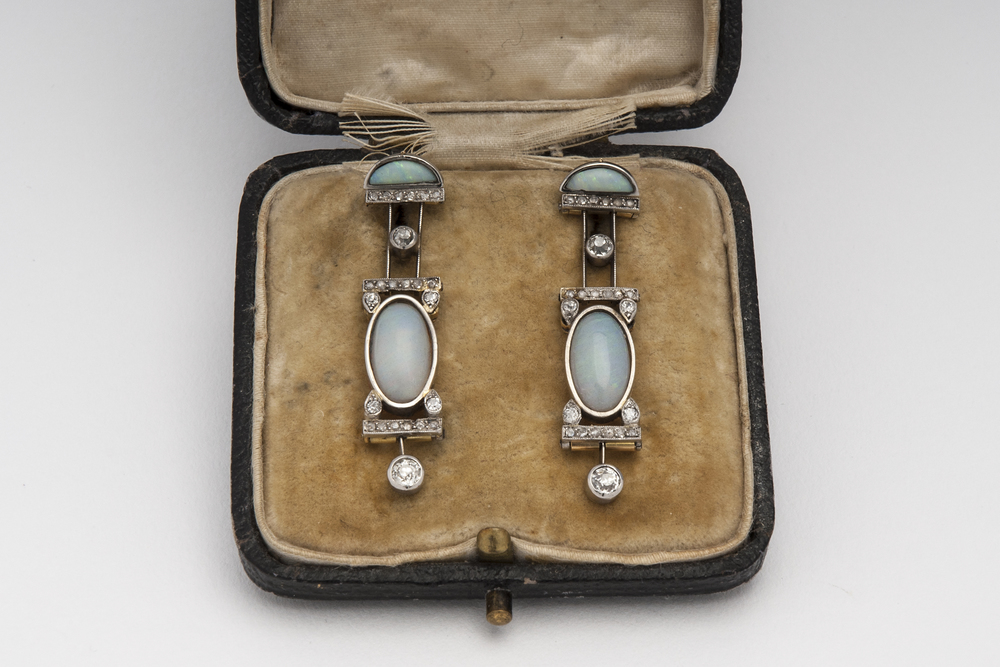 ORECCHINI PENDENTI IN ORO, ARGENTO, DIAMANTI E OPALI decorati con opali e diamanti taglio antico A PAIR OF GOLD, SILVER, DIAMOND AND OPAL PENDANT EARRINGS