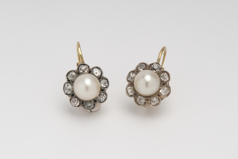 ORECCHINI CON PERLE E DIAMANTI decorati con perla e 8 brillanti taglio antico, chiusura a monachina A PAIR OF PEARL AND DIAMOND EARRINGS
