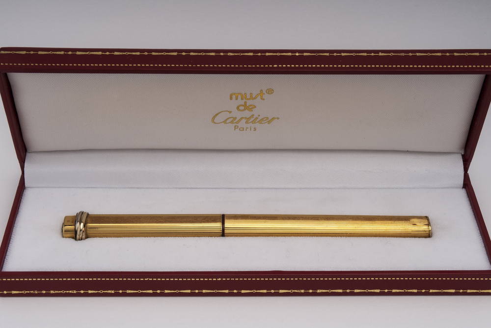 CARTIER - PENNA A SFERA modello 'Vendome" Must de Cartier, cassa placcata oro, di forma ovoidale-rettangolare, nel suo astuccio originale A MUST DE CARTIER VENDOME BALLPOINT PEN