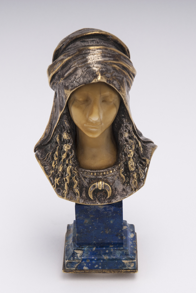 LEONARD AGATHON (1841- 1923) - 'BUSTE INNOCENCE', FRANCIA, INIZIO XX SECOLO Piccolo busto orientaleggiante di giovane donna, in avorio, bronzo argentato e base in lapislazzulo. La base adibita a sigillo, H cm 9 Bibliografia di riferimento: per un esemplare simile, Ingelore Böstge & Emmanuelle Héran 'Agathon Léonard: Le Geste Art Nouveau', Somogy éditions d'art, 2003, pag. 100, cat. 84 A FRENCH CARVED IVORY, SILVERED BRONZE AND LAPIS LAZULI BUST OF A YOUNG WOMAN. SIGNED BY LEONARD AGATHON. EARLY 20th CENTURY