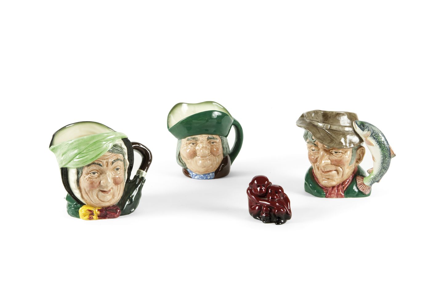ROYAL DOULTON ENGLAND Lotto composto da quattro oggetti in ceramica, manifattura Royal Doulton: tre boccali raffiguranti Sairey Gamp, Toby Philpots, the Poacher; e due scimmiette abbracciate. rispettivamente cm 18 e 7