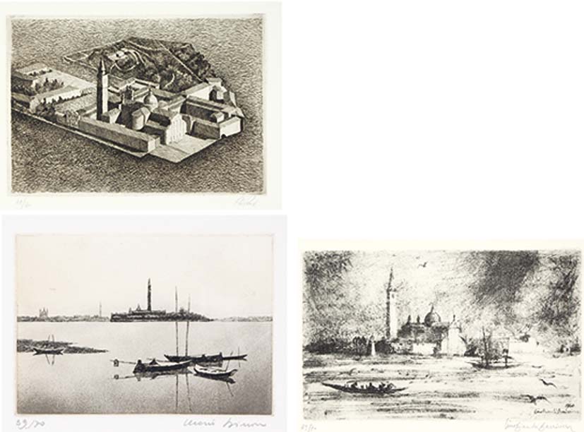 AUTORI VARI Soggetti Vari lotto di sei acqueforti es. 39/70 Misure: 50x35 cad. firma e tiratura in basso - facenti parte della cartella San Giorgio Isola Regina Remo Wolf 1968 Mario Guadagnin Pio Penzo Bruno Colorio Mario Dinon Bianchi Ba