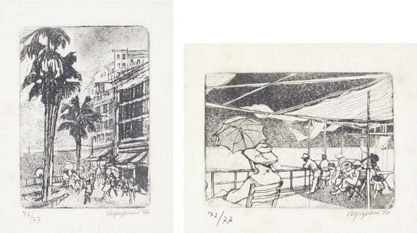 VESPIGNANI RENZO Roma 1924 - 2001 Soggetti Vari 1954 lotto di due acquaforti es. 72/77 Misure: 11x8(lastra)30x28 (foglio) firma data e tiratura in entrambe esposizioni Galleria Ravagnan Venezia - timbro al retro