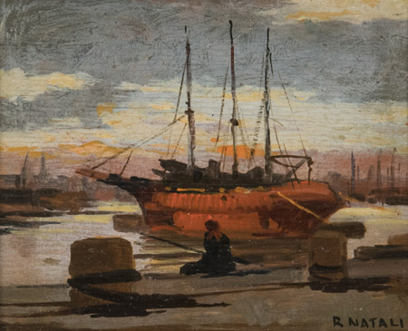Renato Natali (Livorno 1883 1979) Pescatore al molo Olio su tavola, cm. 20,4x25 Firmato in basso a destra. Sul verso: timbro e firma "Alberto e Carlo Chiellini", Livorno.