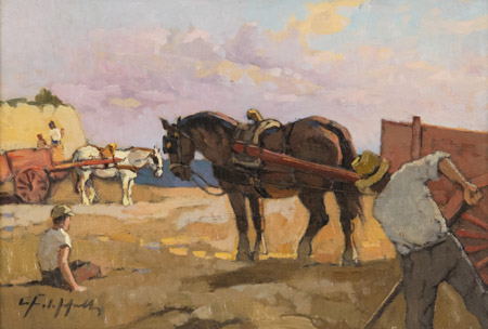Cafiero Filippelli (Livorno 1889 1973) Renaioli anni '30 Olio su tavola, cm. 25x35 Firmato in basso a sinistra; Sul verso: firma e titolo; Sul verso: Timbro "Galleria d'Arte Athena", Livorno. Opera pubblicata sulla brochure Galleria d'Arte Corsini, Livorno.