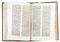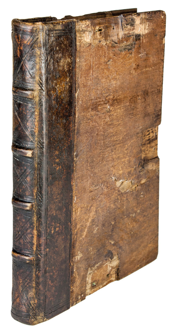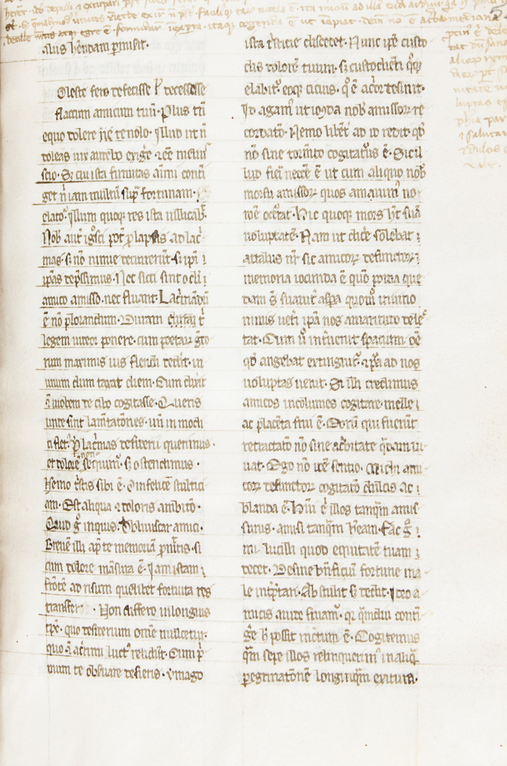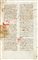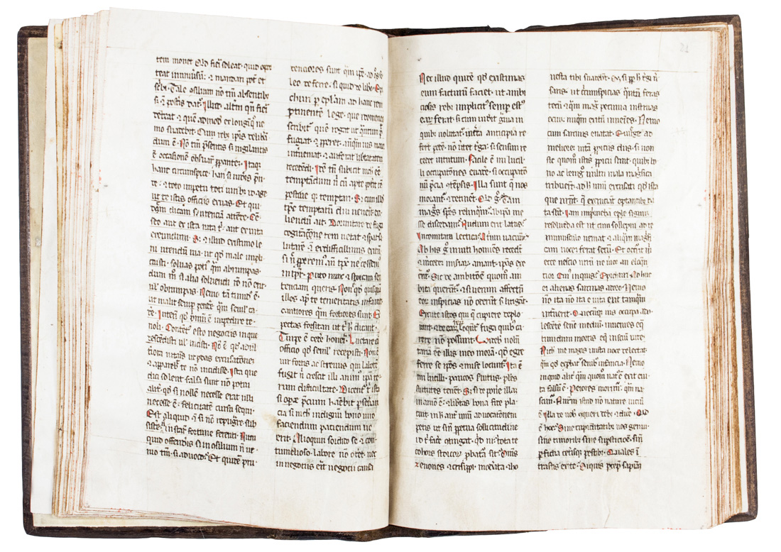 Manoscritto pergamenaceo in-8° (mm 211x142). Carte [66], le ultime 2 bianche ma con rigatura ad inchiostro coeva. Testo latino vergato da trecentesca mano in inchiostro bruno in 2 colonne su 31 linee. Interamente rubricato in rosso; due grandi capilettera su 6 e 5 linee, rispettivamente a carta 1r e 3v, il secondo filigranato in inchiostro rosso e nero. Esemplare un po' rifilato, con perdita di parte delle glosse, e con una lacuna risarcita in pergamena successiva nel margine inferiore bianco della prima carta, che interessa parzialmente l'ultima riga di testo, ma nel complesso copia eccezionale. Legatura monastica con banda di cuoio decorata a freddo al dorso e ai piatti, su assi nude senza più i fermagli; sguardie in pergamena rimontate. Molti interventi a margine di differenti mani trecentesche e quattrocentesche sempre in inchiostro bruno come correzioni al testo, glosse e aggiunte, maniculae, "forellini" e notabili. In apertura e chiusura del codice la sigla Te (o Fe?) sey (o say?), forse una nota di possesso sempre di mano coeva.