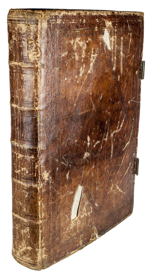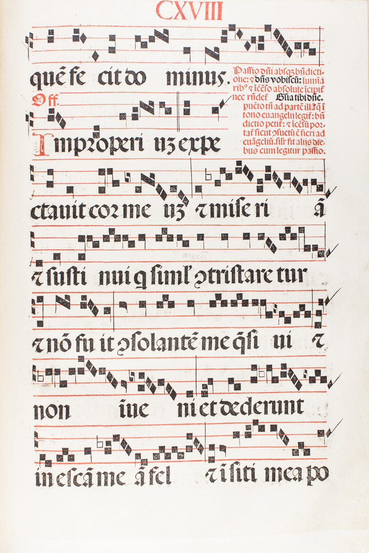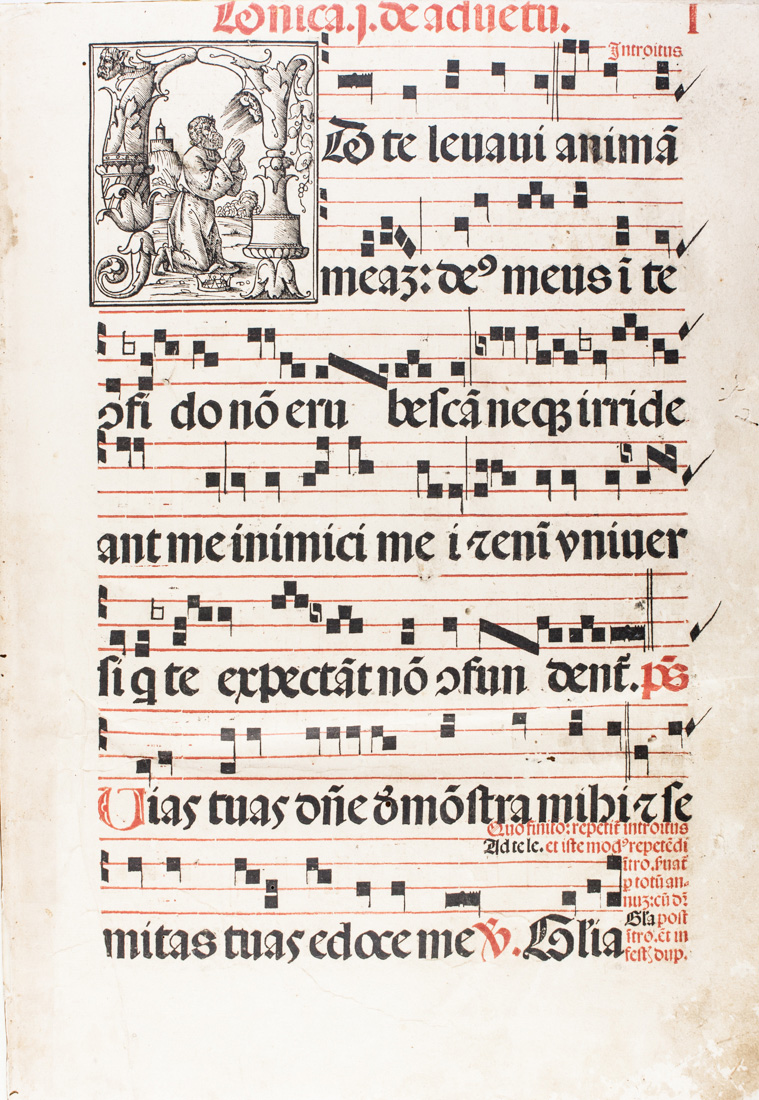 1 volume (di 3) in-folio (mm 490x340). Carte CCXVIII [ma 216 per mancanze]. Segnatura: [π]1 (-π1) a7(8-1) b-s8 t10 (-t10); v-z8 [et]8 [cum]8 [rum]8 2[rum]8. Testo in caratteri gotici stampato in inchiostro nero e rosso, rubricatura in rosso, notazione quadrata su tetragramma stampato in rosso. Con 8 grandi capilettera istoriati incisi in legno da Benedetto Bordon (mm 118x100), di cui uno acquarellato in giallo. Esemplare scompleto del frontespizio e di carta 154 sostituita da una bianca; non manca carta 145, non presente per salto nella numerazione come in tutti gli esemplari, ma di diverso avviso doveva essere il legatore settecentesco che ha inserito una carta bianca fra t1 e t2. Copia molto rifilata nel margine superiore, con molte brachette di rinforzo nel margine inferiore delle carte e talvolta in quello interno, applicate anticamente, qualche forellino di tarlo e altre mende. Legatura settecentesca in piena pelle con ampie decorazioni a freddo ai piatti e al dorso; fermagli conservati. Abrasioni, spellature e tre lacune nella pelle.