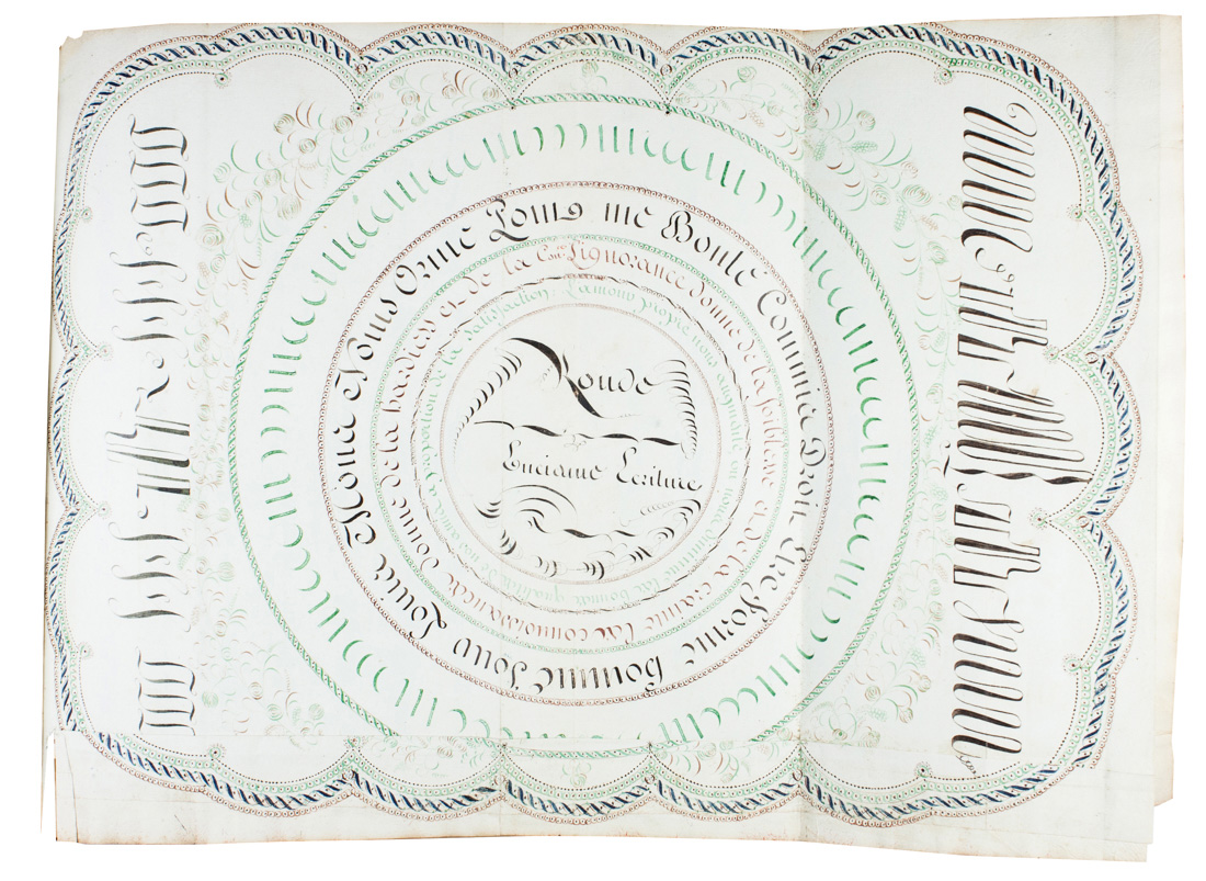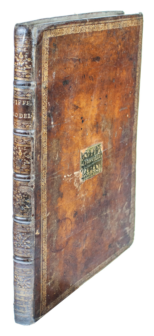 Manoscritto cartaceo in-folio (mm 412x270). Carte [47], di cui 12 più volte ripiegate. Vergato da un'unica settecentesca mano in inchiostro bruno, verde, blu e nero anche su carta celestrina; testo entro belle e varie cornici calligrafate. Molte carte hanno margini esterni più corti, pareggiati con aggiunte di carta antica. Qualche difetto ma nel complesso ben conservato. Legatura coeva in piena pelle con cornice a fregi fitomorfi ai piatti e tassello con nome del mercante impresso in oro applicato al centro del piatto anteriore, titoli e fregi impressi in oro al dorso; abrasioni, qualche macchia e altre trascurabili mende.