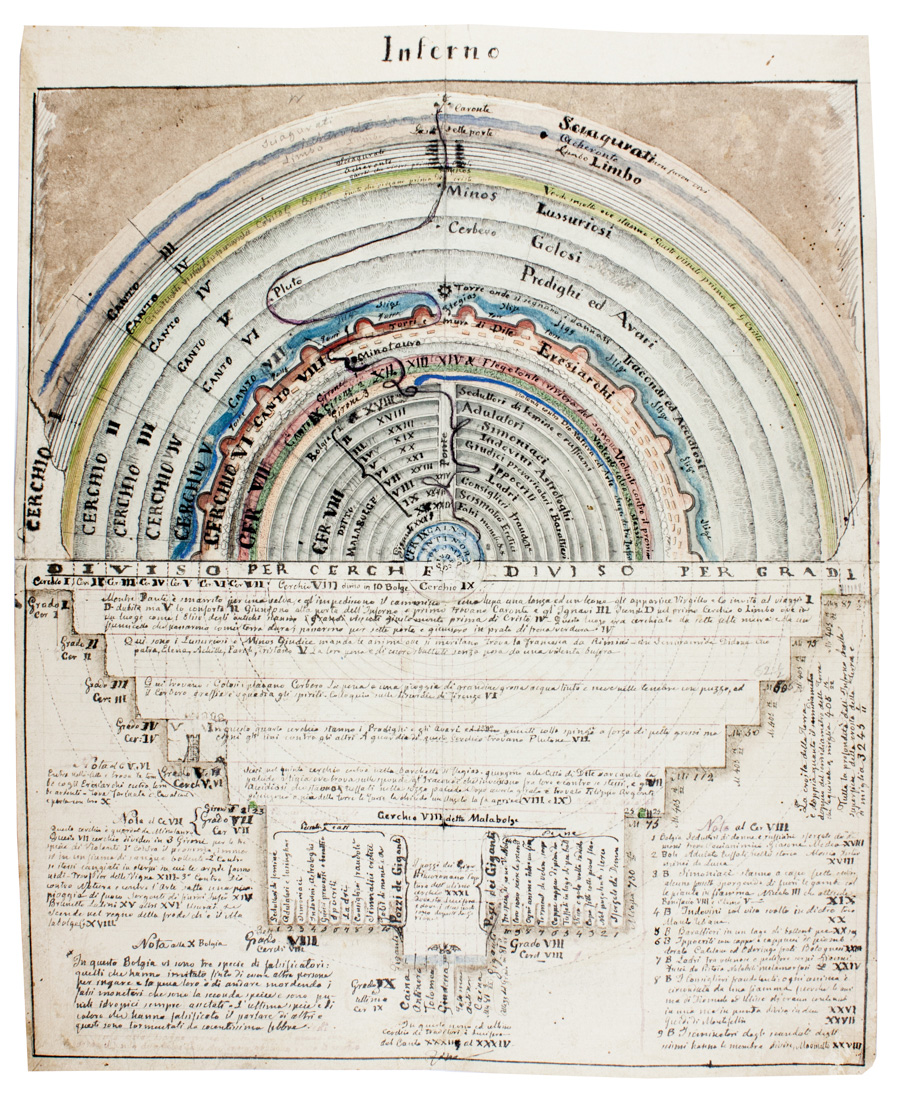 Manoscritto cartaceo (mm 430x348). 1 foglio con in alto raffigurazione schematica dei Gironi danteschi finemente acquarellata e in basso didascalie e note vergate in inchiostro nero. Strappetti lungo le pieghe del foglio ma nel complesso buona conservazione.