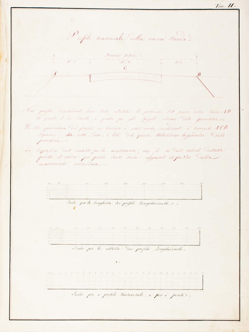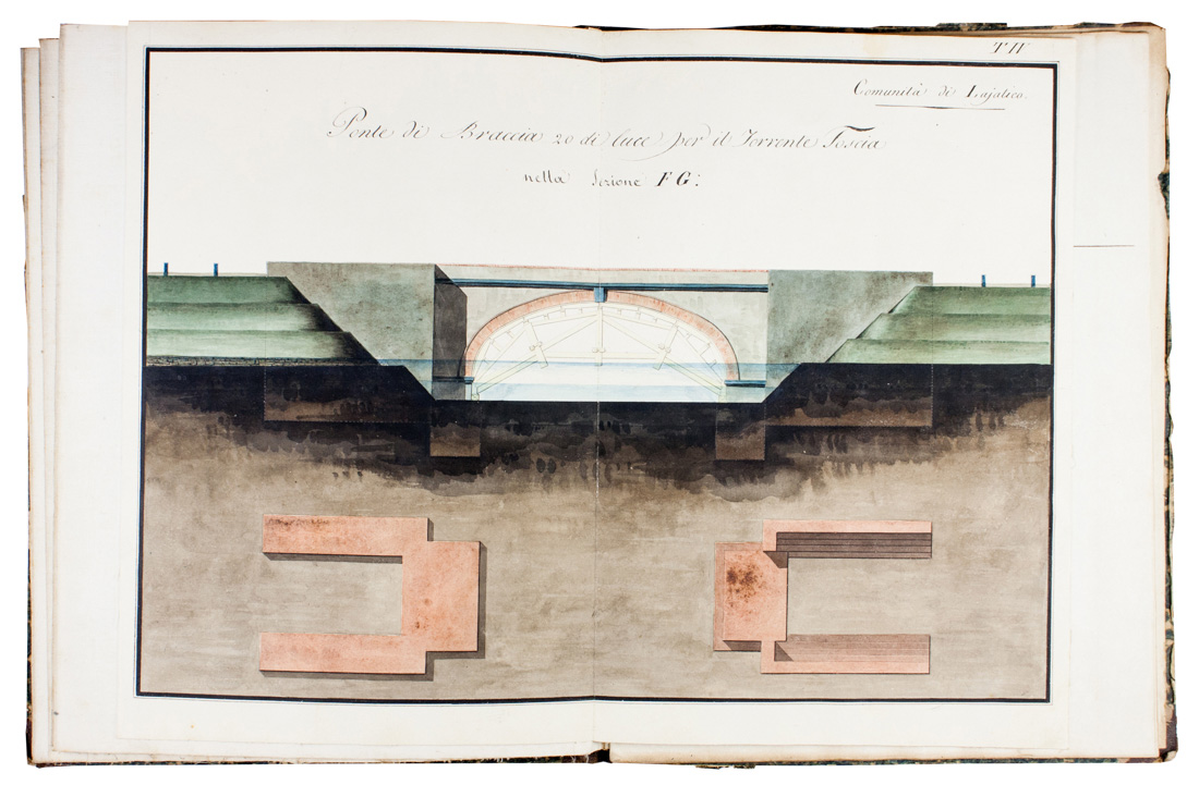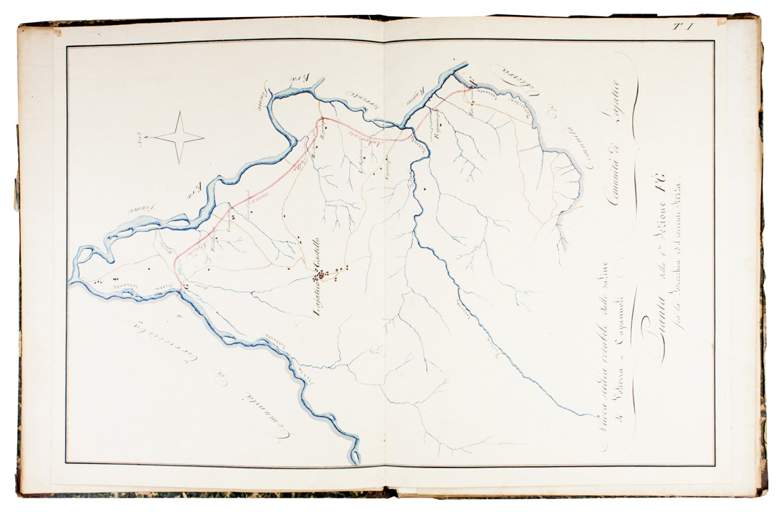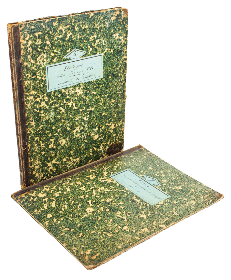 Manoscritto cartaceo in-folio (mm 355x265). Carte [12], l'ultima bianca, con frontespizio e Profili in traverso della sesta sezione FG dalla Foscecchia al torrente Sterza, precedute da 4 tavole numerate intelate di cui 2 a doppia pagina e 2 più volte ripiegate, il tutto finemente acquarellato. Legatura coeva in mezza pelle con piatti in carta marmorizzata, titoli su tassello cartaceo al piatto anteriore: Disegni della sezione FG. Comunità di Lajatico. Punte stanche e altri segni del tempo. SI AGGIUNGE: [Carta del generale andamento, profilo e ponticelli]. 1846 ca. Carte [5] con un frontespizio e 5 tavole numerate II-VI, manca la prima. Legatura coeva in mezza pelle con piatti in carta marmorizzata, titoli su tassello cartaceo al piatto anteriore.(2)