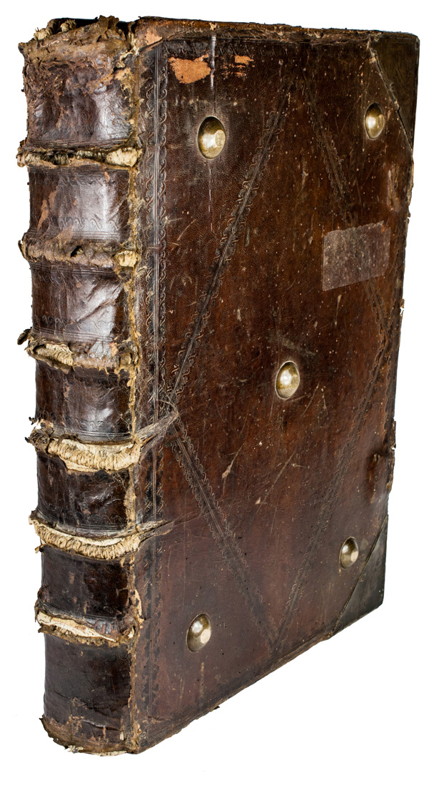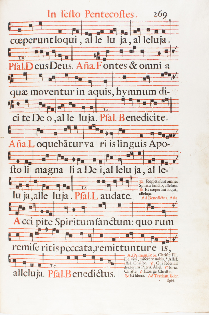 In-folio (mm 485x350). Pagine 476, LXVII. Grande marca incisa in rame al frontespizio stampato in rosso e nero, al pari del testo. Notazione quadrata su tetragramma stampato in rosso. Mancanza nell'angolo inferiore del frontespizio, alcune gore d'acqua marginali, qualche strappetto ma nel complesso discreto esemplare. Legatura settecentesca in pelle con ampie impressioni a secco ai piatti e al dorso, con 5 borchie e due punte in metallo su ciascun piatto. Manca la borchia centrale nel piatto posteriore. Annotazioni manoscritte al recto di pagina LXVII.