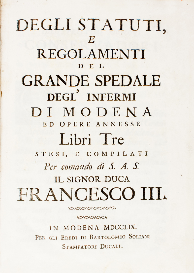 Degli Statuti e regolamenti del grande Spedale degl'Infermi di Modena ed opere annesse libri tre...
