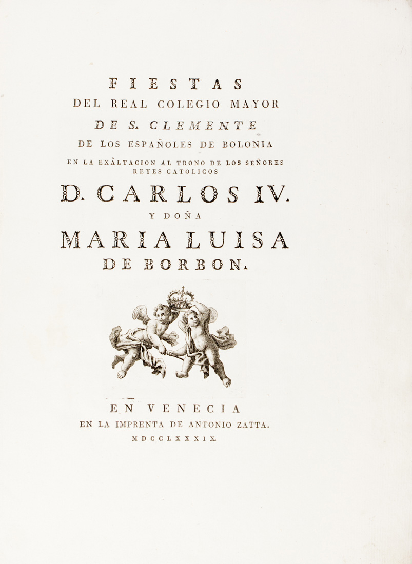 Fiestas del Real Colegio Mayor de S. Clemente de los Españoles de Bolonia en la exaltacion al Trono de los Señores Reyes Catolicos D. Carlos IV y Doña Maria Luisa de Borbon.