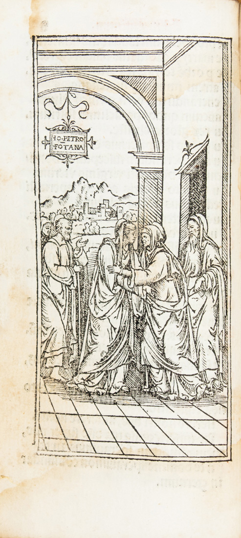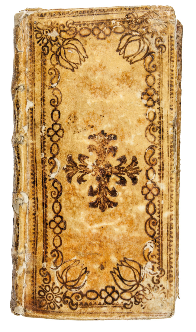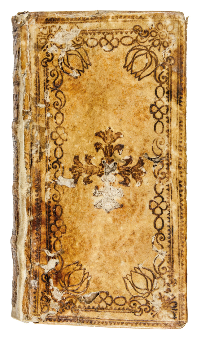 In-12° (mm 140x70). Carte [36], 180 (ma 178, mancano le carte 78-79), [10] (di 12) con moltissime vignette nel testo, bei capilettera figurati e 17 illustrazioni a piena pagina di cui alcune a firma di Io Petro Fontana. Marca dello stampatore incisa in legno al frontespizio e ripetuta più grande in fine. Frontespizio e testo in rosso e nero. Gore d'acqua, strappetti marginali e altre mende. Legatura coeva in pergamena rigida con fregio floreale impresso a secco al centro dei piatti e graziosa cornice di quadruplo filetto contornato da motivo a dente di topo e fregi floreali all'interno, titoli e fregi impressi a secco al dorso. Lacune sia ai piatti che al dorso, anche reintegrate con pergamena posteriore. Tagli dorati e cesellati.