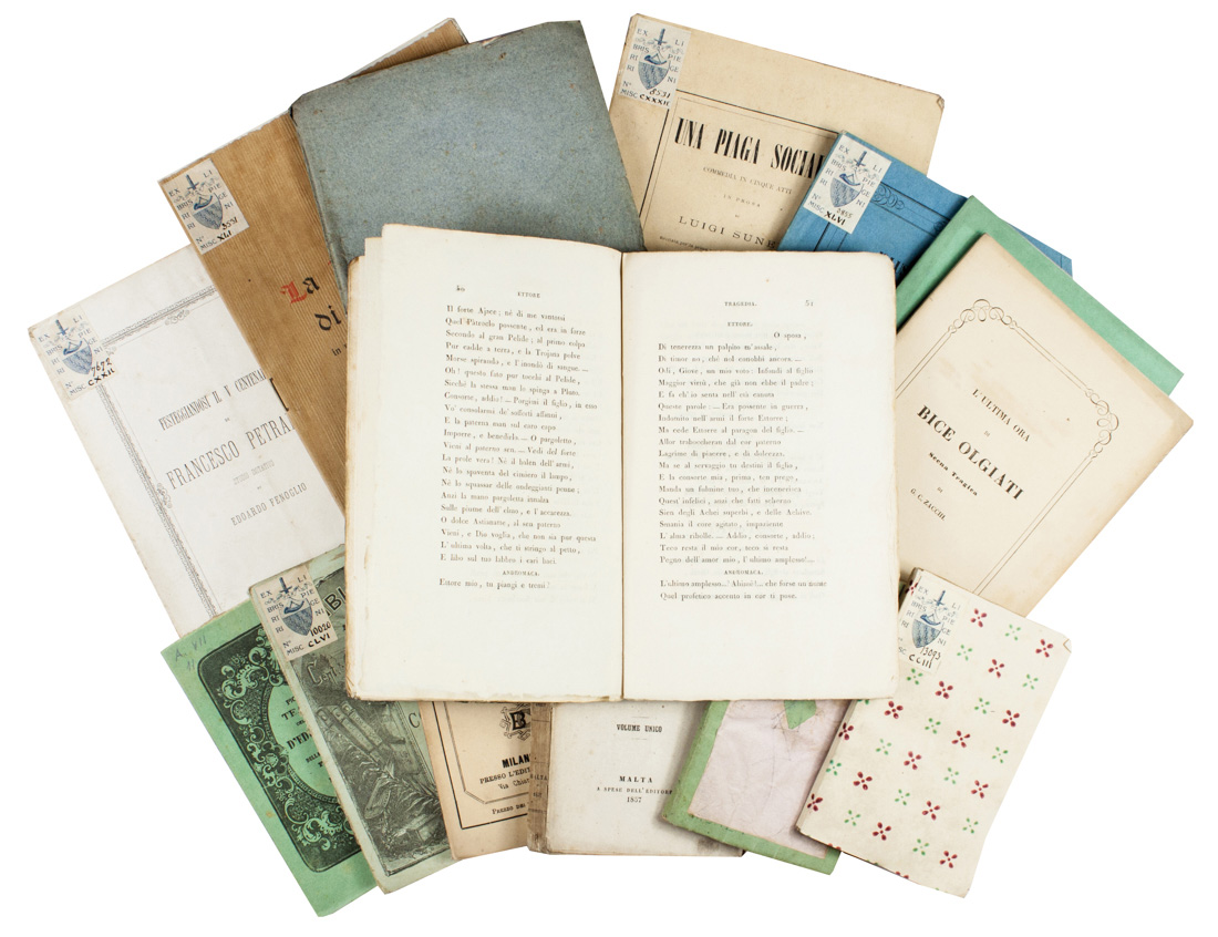 Raccolta di 16 placchette contenenti operette teatrali o libretti per commedie e drammi stampate in varie città italiane dal finire del Seicento ai primi anni del Novecento. Quasi tutte in brossura editoriale, ex-libris Pieri Gerini applicato al piatto anteriore. Buona conservazione.(16)