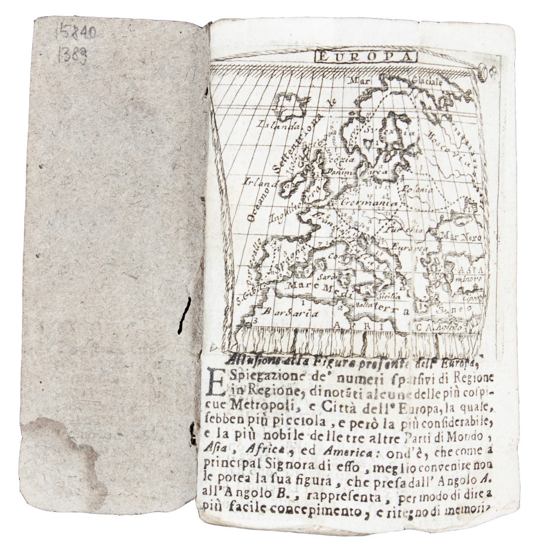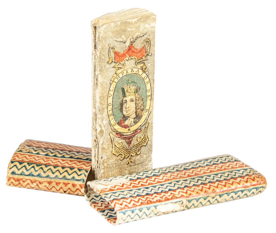In-32° (mm 80x30). Carte 60, le prime e le ultime due più volte ripiegate. Con una carta geografica ripiegata nel testo, vignette allegoriche dei vari mesi e molte medaglie con effigi di imperatori romani incisi in legno nel testo. Brossura editoriale illustrata con ritratto di Carlo VI al piatto anteriore e dell'Imperatrice Elisabetta a quello posteriore, in coloritura coeva, lievemente lisa. Conservato in custodia in cartonato rivestita di carta xilografata.