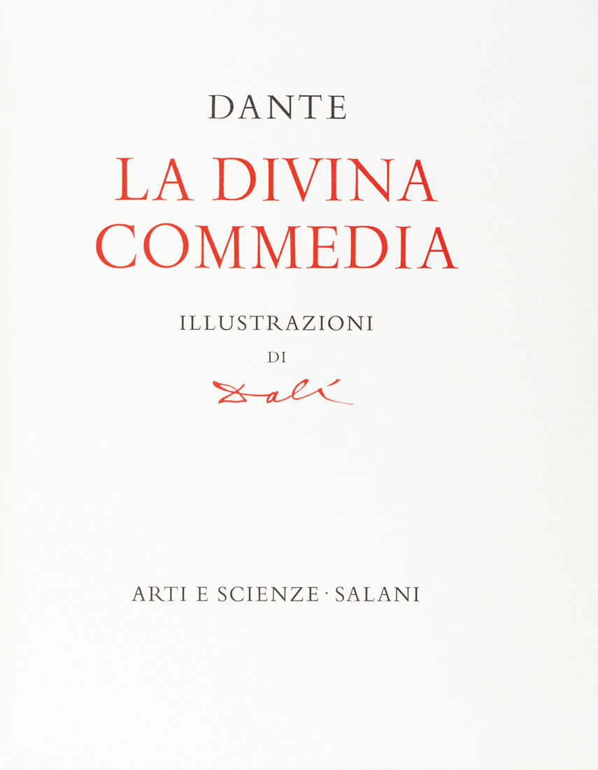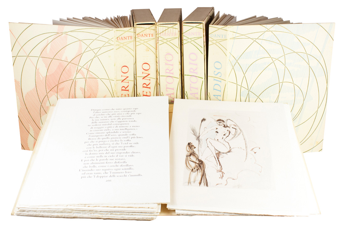 6 volumi in-folio (mm 340x265). Pagine [4], 158, [2]; [12], 173-326 con 34 tavole a colori fuori testo numerate 1-33; [2], 162, [2]; [12], 173-328, [4] con 33 tavole a colori fuori testo numerate 1-33; [2], 163, [1]; [12], 173-320, [4] con 33 tavole a colori fuori testo numerate 1-33. A fogli sciolti. Occhietto inciso in rosso in principio di ogni volume; testo stampato a due colori, rispettivamente rosso per i due tomi dell’Inferno, viola per il Purgatorio e blu per il Paradiso. Ottima conservazione. Esemplare non numerato, uno dei 2900 su una tiratura complessiva di 3044 copie. Ciascun volume con brossura, cartella e custodia in cartonato editoriali, con lievi tracce di muffa. Conservati anche i cofanetti in cartone e i tagliandi di controllo.(6)