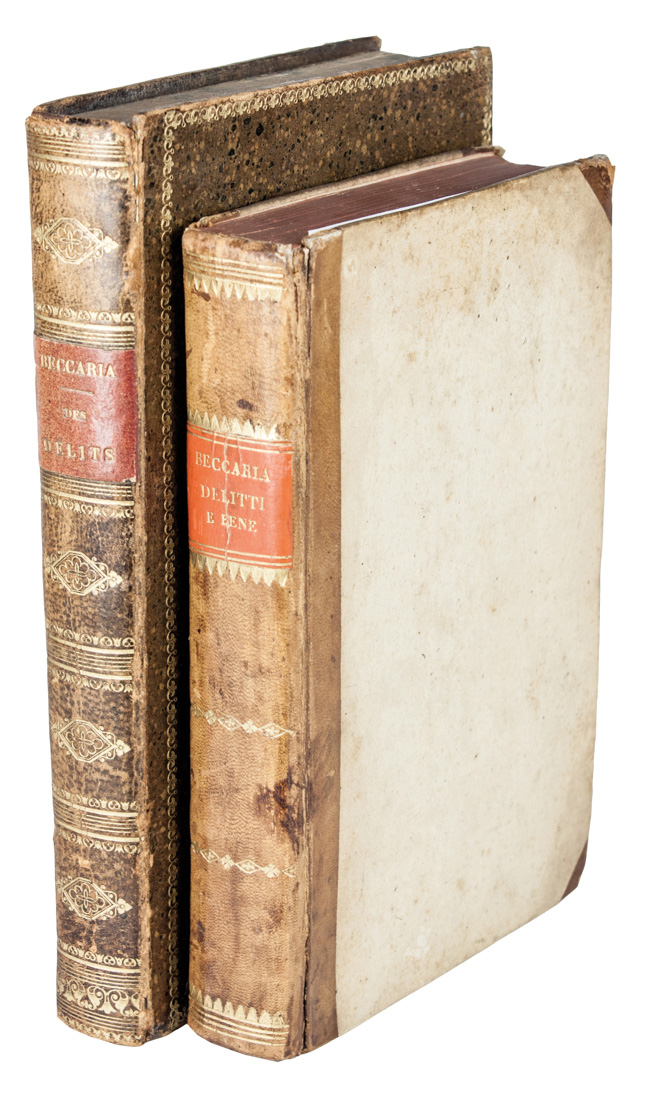 In-8° (mm 183x115). Pagine [2], 314, [6]. Antiporta allegorica calcografica e fregio inciso in rame al frontespizio. Ottimo esemplare, con lievi bruniture in fine. Legatura ottocentesca in mezza pelle con punte, titoli dorati su tassello al dorso. Lisi le punte e le cerniere. Ex-libris applicato al contropiatto. SI AGGIUNGE: Id., Des délits et des peines [...]. Traduction nouvelle, avec le Commentaire de Voltaire, la Réponse de Beccaria aux notes et observations de Facchinei.... Paris: Brière, 1822. In-8° (mm 204x130). Pagine XXXII, 423, [1]. Buon esemplare. Legatura coeva in piena pelle marmorizzata con graziosa roulette impressa in oro ai piatti, titoli dorati su tassello al dorso.(2)