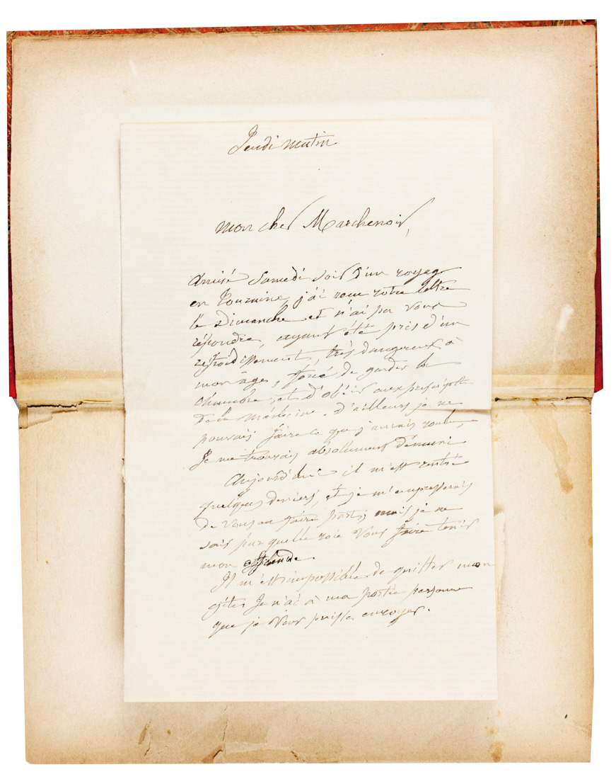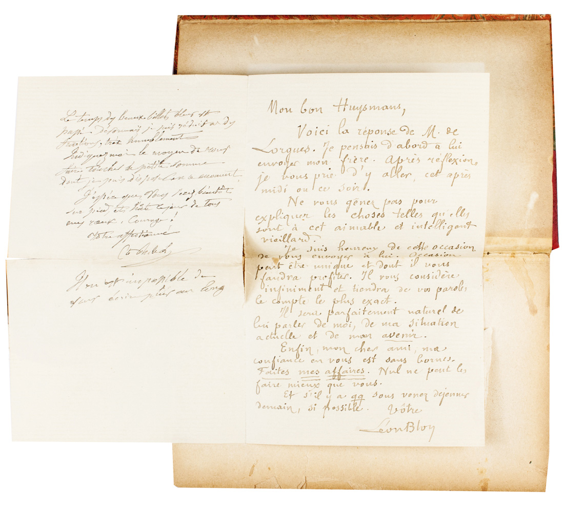 In-8° (mm 183x113). Pagine XI, [1], 382, [2]. Lievemente ingiallito e con qualche strappetto marginale, più consistenti alla prima carta con l'elenco delle opere dell'Autore stampate. Legatura moderna in mezza tela con piatti marmorizzati. Brossura editoriale conservata all'interno. Applicata al recto del catalogo delle opere una lettera autografa firmata di Bloy indirizzata a Huysmans, vergata in inchiostro bruno nel secondo foglio di una lettera del conte di Lorgues indirizzata all'Autore.