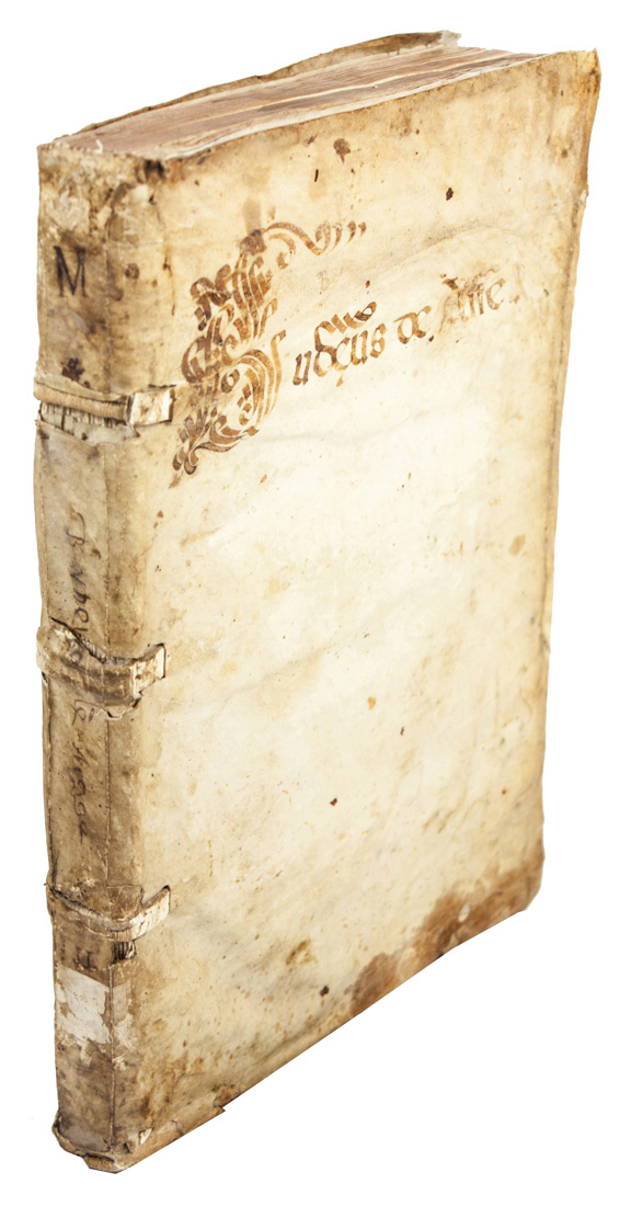 In-folio (mm 322x22). Carte [8], CXCIII, [1]. Frontespizio stampato in inchiostro rosso e nero ornato di una superba cornice istoriata, con al centro grande marca tipografica raffigurante tre uomini al torchio incise in legno. Grandi capilettera filigranati su sfondo nero puntinato. Qualche rara fioritura a poche carte e lievi gore marginali lungo il volume ma ottimo esemplare ad ampi margini. Legatura coeva in pergamena semifloscia con titoli manoscritti al dorso e al piatto anteriore. piccole mancanze al dorso e alle cerniere, antichi reintegri ai risvolti e lacerti di legacci. Glosse di cinquecentesca mano al testo.