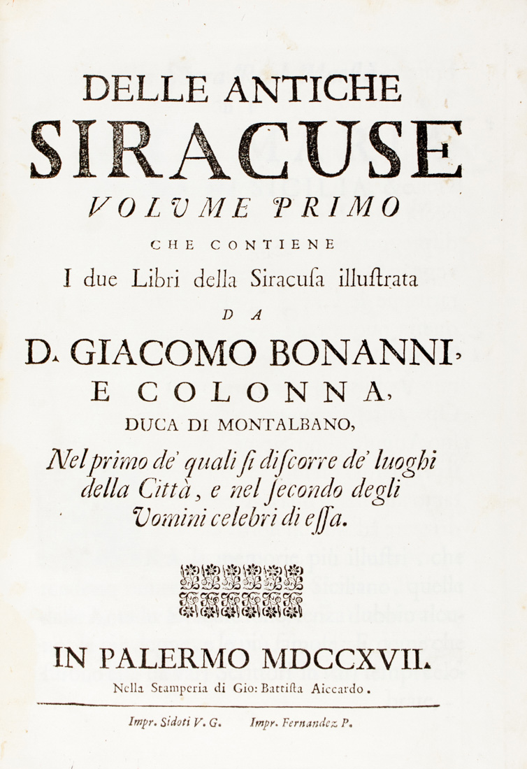 Buonanni Giacomo, Mirabella Vincenzo, Delle antiche Siracuse volume primo (-secondo).