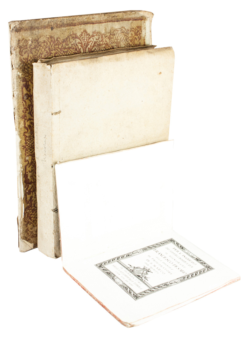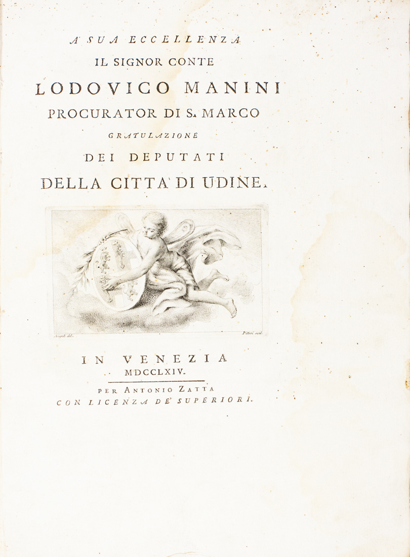 In-4° grande (mm 338x240). Pagine XXVI, 1 bianca. Antiporta con veduta di Villa Manini di Passariano e del castello di Udine, stemma del Manini al frontespizio, un capolettera e due vignette a mo' di testatina e finalino, il tutto disegnato da Angeli e inciso all'acquaforte da Pitteri. Ampie gore d'acqua lungo il volume, più evidenti in principio, ma bella copia ad ampi margini. Cartonato coevo rivestito in carta decorata con impressioni calcografiche in inchiostro rosso raffiguranti gli stemmi della famiglia Manini e di Udine, con mancanze. SI AGGIUNGE: Id., De Jo. Hieronymo Zuccato Equite ac venetae reipublicae magno Cancellario Oratio. Venetiis: Ex Typographia Albritiana, 1772. In-4° grande (mm 338x235). Pagine XVII, [1]. Frontespizio in inchiostro rosso e nero con bella vignetta calcografica, capolettera e due vignette a mo' di testatina e finalino, il tutto inciso in rame. Cartonato coevo rivestito in carta xilografata con le armi di Zuccato. SI AGGIUNGE: Per l'Ingresso di sua Eccellenza il Signor Cav. Francesco Pesaro alla dignità di Procuratore di S. Marco... In Vicenza: Nella stamperia Turra, 1781. SI AGGIUNGE: Morosini Andrea, Storia della Repubblica veneziana... In Venezia: dalle Stampe di Antonio Zatta, 1782. 1 volume (di 5) in barbe e in cartonato coevo.(4)