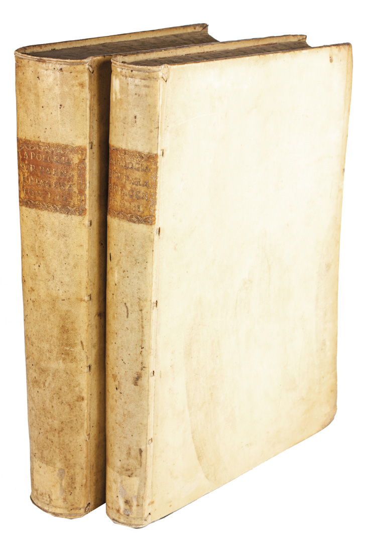 Tre parti in 2 volumi in folio (mm 330x205). Pagine [24], 512, [2], 1 bianca; [8], 267, [2], 3 bianche; [8], 538, [4]. Ogni parte introdotta da frontespizio autonomo, fregiato da piccola calcografia con stemma. Al primo volume gore marginali passim, un piccolo di tarlo all’angolo inferiore esterno dei fascicoli S-Z senza perdite e macchia marginale alle pagine 447-449. Al secondo volume strappo restaurato a pagina 113, ma bellissimo esemplare con ampi margini e fresca inchiostratura. Legatura coeva in piena pergamena rigida con titolo su tassello in oro al dorso, sguardie marmorizzate e tagli spruzzati.(2)