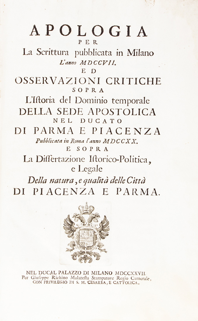 De Colla Giovanni Martino Felice, Apologia per la scrittura pubblicata in Milano l'anno 1707 ed osservazioni critiche sopra l'istoria del Domino temporale della sede apostolica nel ducato di Parma e Piacenza…