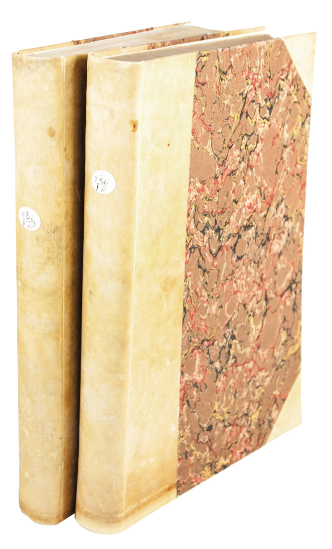 2 volumi in-folio (mm 340x226). Pagine [12], 539, 1 bianca; [4], 484, [22], 2 bianche. Al primo volume frontespizio impresso a due colori, con grande marca xilografica. Numerosi legni lungo il testo. Una gora d’acqua all’angolo superiore esterno delle carte del primo volume con conseguente perdita di carta, integrata con restauro alle prime 15 carte del volume e negli ultimi 8 fascicoli; altre integrazioni marginali in fine del secondo volume. Arrossature e bruniture diffuse, opera fortemente rifilata nel margine superiore delle carte e complessamente in mediocri condizioni, ma completa. Legatura settecentesca in mezza pergamena con punte e piatti in carta marmorizzata. Sguardie rinnovate. Lunga nota manoscritta cassata all’occhietto di entrambi i volumi.(2)