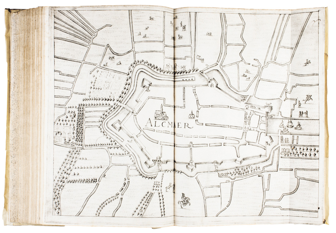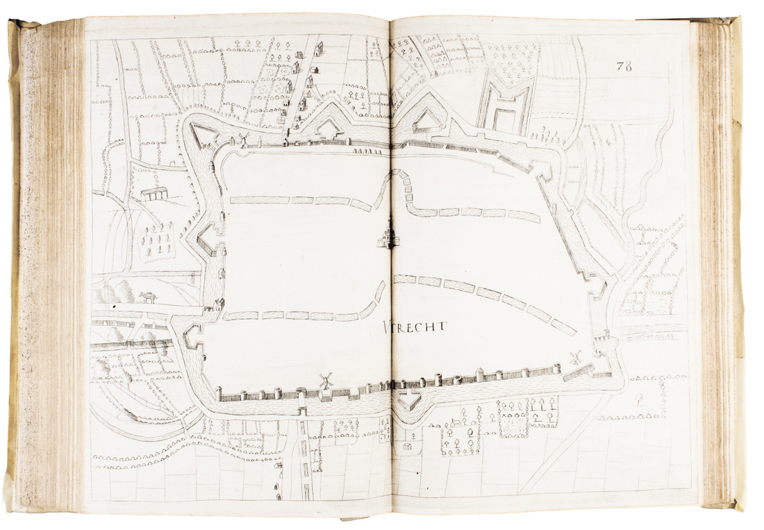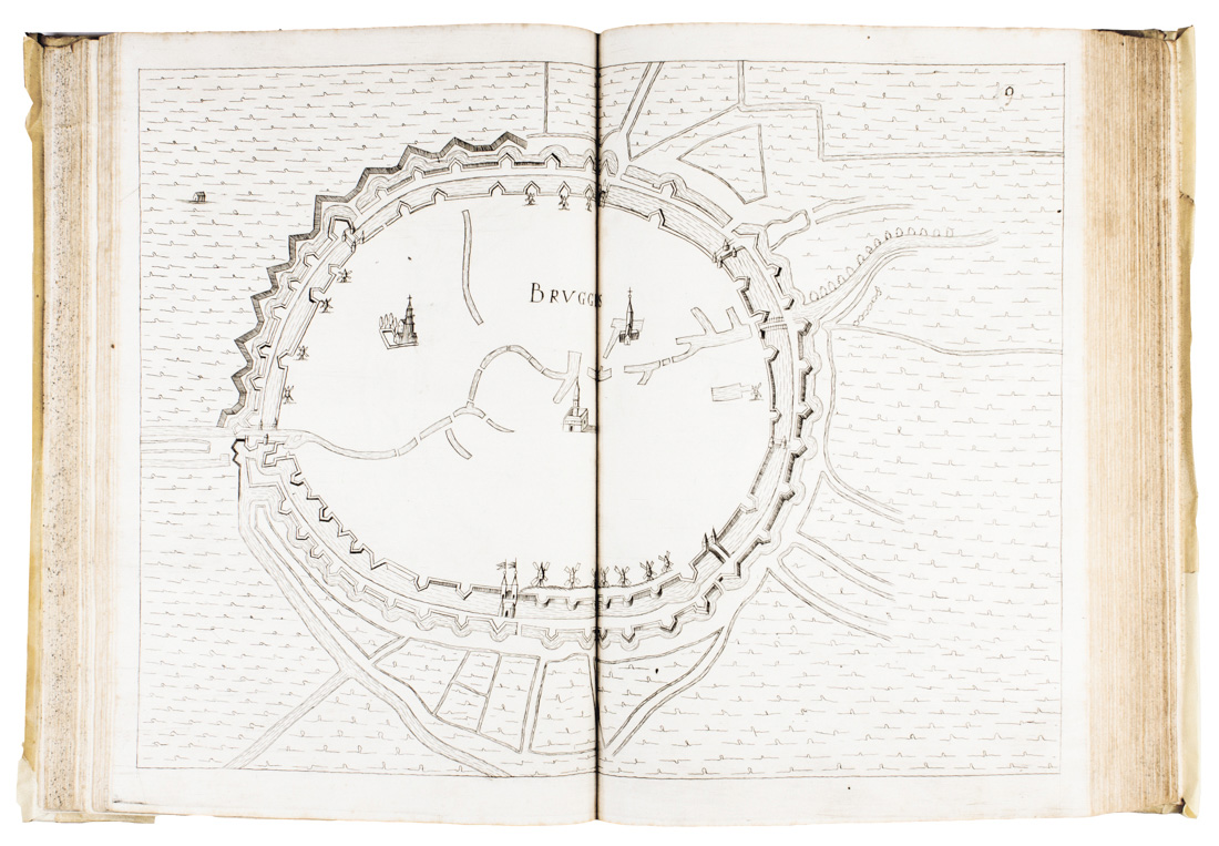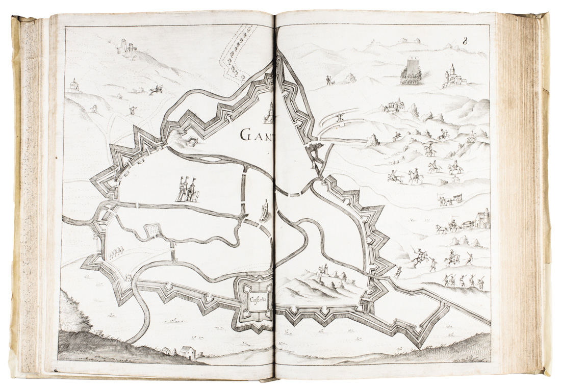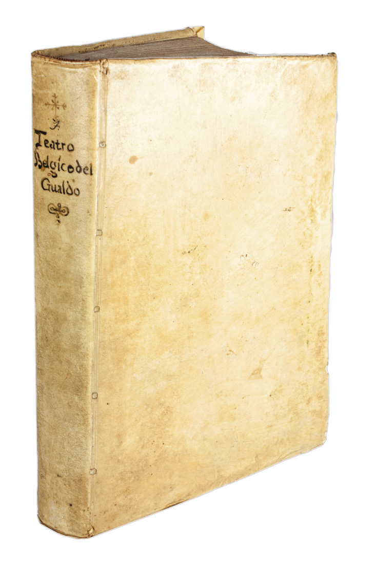 In-folio (mm345x225). Pagine [14], 148, 6 con 1 antiporta con gli stemmi delle 17 Province e 134 carte di tavole fuori testo che includono 12 ritratti a piena pagina, 2 tavole a doppia pagina raffiguranti teatri di battaglia e 120 mappe incise a doppia pagina, numerate a penna o in lastra, il tutto calcografico. Esemplare scompleto della grande carta geografica più volte ripiegata. Testo e frontespizio entro cornice tipografica incisa in legno. Qualche lieve fioritura e leggere gore d'acqua ad alcune carte di testo e di mappe, alcune tavole brunite, uno strappo marginale alla mappa n. 25 e un forellino alla n. 73. Legatura coeva in pergamena rimontata su assi di legno e con sguardie rinnovate; piccole lacune reintegrate alle estremità dei piatti.