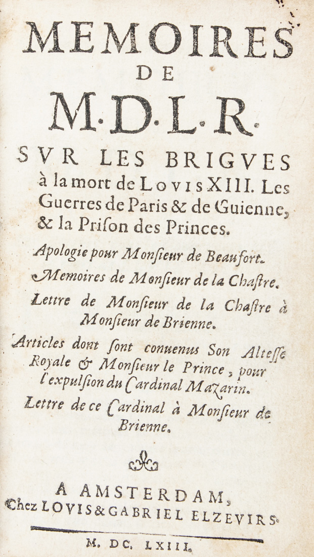 In-8°(mm 180x114). Pagine XXIV, 154, XIV con 1 ritratto dell'Autore in antiporta inciso in rame da Choffard su disegno di Petiot. Bellissimo esemplare con alcune lievi fioriture alla carta del ritratto. Legatura coeva firmata Bradel successore di Derome le jeune in marocchino rosso con piatti inquadrati da roulette di fregi floreali delineata da duplice filetto e altra cornice a catenella più interna a motivi geometrici impresse in oro, titoli e piccoli ferri floreali impressi in oro al dorso. Doublures in seta verde e marocchino rosso decorato in oro. Entro custodia in cartonato. Ex-libris George Soaper al contropiatto. SI AGGIUNGE: Id., Memoires [...] sur les brigues à la mort de Louis XIII... Amsterdam [ma Bruxelles]: Louis et Gabriel Elzevirs [ma Foppens], 1663. In-12° (130x75). Pagine 339, [1]. Bruniture diffuse. Legatura coeva in piena pelle maculata con triplice filetto impresso in oro ai piatti e titoli dorati su tassello al dorso; un poco lisa.(2)