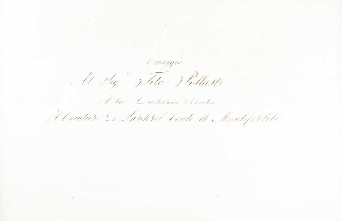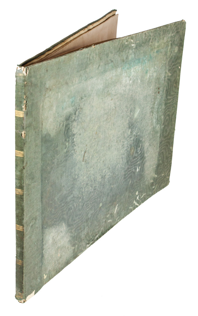 Album in-folio oblungo (mm 355x530). 16 vedute litografiche disegnate da Giorgetti e incise da Ballagny. Ampie gore d'acqua lungo tutto il volume, tracce di muffa in fine, strappo a una tavola che interessa parte dell'inciso. Legatura coeva in piena tela verde, rovinata. Nella prima carta bianca ex-dono manoscritto: «Omaggio al Sig.re Tito Pollasti (sic!) il suo Devotissimo Servitore Il Cavaliere de Larderel Conte di Montecerboli».
