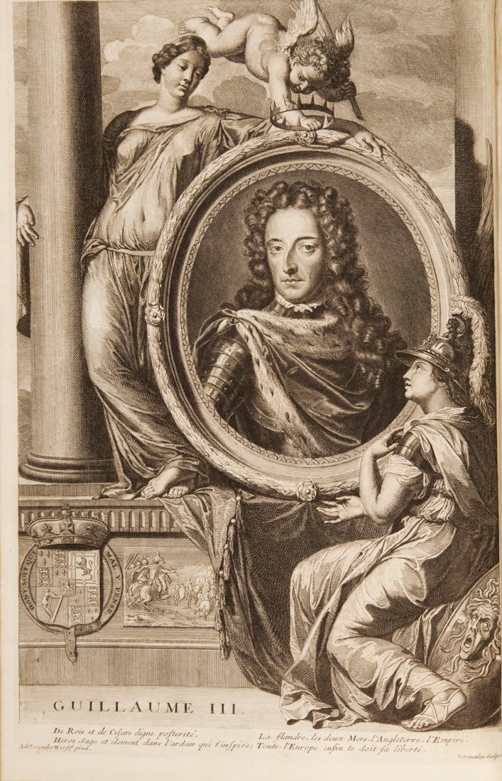 5 parti in 4 volumi in-folio (mm 370x235). Pagine [22], 928, [36] con 33 ritratti fuori testo; [10], 779, [35] con 17 ritratti fuori testo; [24], 562; [12], 563-938, [62], [48], [4]; [8], XI, [1], 885, [49] con 16 tavole fuori testo. Con nel complesso 66 ritratti calcografici e 2 antiporte (ai volumi I e IV). L'opera è come di consueto sprovvista del ritratto di Maria Beatrice principessa di Modena, previsto dall'indice del IV volume ma mai stampato. Bruniture leggere ad alcune carte, concentrate in pochi fascicoli, ma testo ben completo e con le tavole in ottima inchiostrazione. Legatura in piena pergamena coeva rigida con unghie e titoli oro su tassello rosso applicato al dorso.(4)