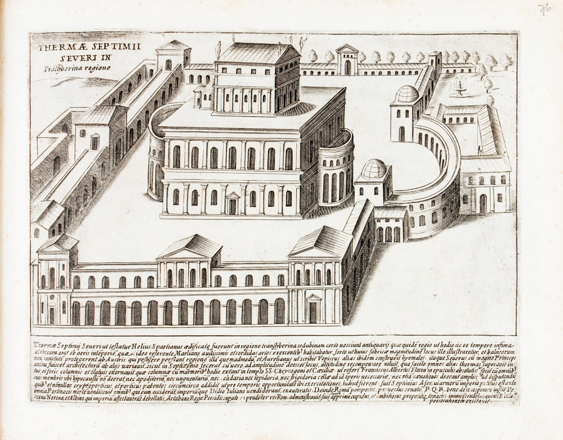 3 parti in 1 volume in-4° oblungo (mm 218x288). Carte [3] di testo e 47 tavole (inclusi 1 frontespizio calcografico, 1 ritratto di Urbano VIII, 1 ritratto di Sigismondo III e 1 Dedicatoria). LEGATO CON: Id., Antiquitatum urbis liber secundus... Romae: S.e. [ma Vitale Mascardi], 1613. Tavole 36 (incluso 1 frontespizio, 1 ritratto di Carlo Emanuele I, 1 carta di Dedica). LEGATO CON: Id., Antiquae urbis splendor complementum. Romae: S.e. [ma Vitale Mascardi], 1615. Tavole 69 (incluso 1 frontespizio e 1 tavola con bella bordura architettonica avant la lettre). Ritratto di Urbano VIII controfondato, alcune tavole provenienti da altre edizioni (controfondate in carta antica per coprire il testo stampato al verso), lievi arrossature e fioriture sparse, alcuni strappetti marginali, margine bianco inferiore ricostruito in circa 15 tavole. Legatura settecentesca in piena pelle con elegante fregio impresso in oro al centro dei piatti e due cornici concentriche di duplice filetto, la più interna con anfore fiorite accantonate esterne; titoli e fregi impressi sempre in oro ai comparti del dorso a 4 nervi. Ex-libris manoscritto Jo: Baptista de Maximis Salamon manoscritto al foglio di guardia anteriore.