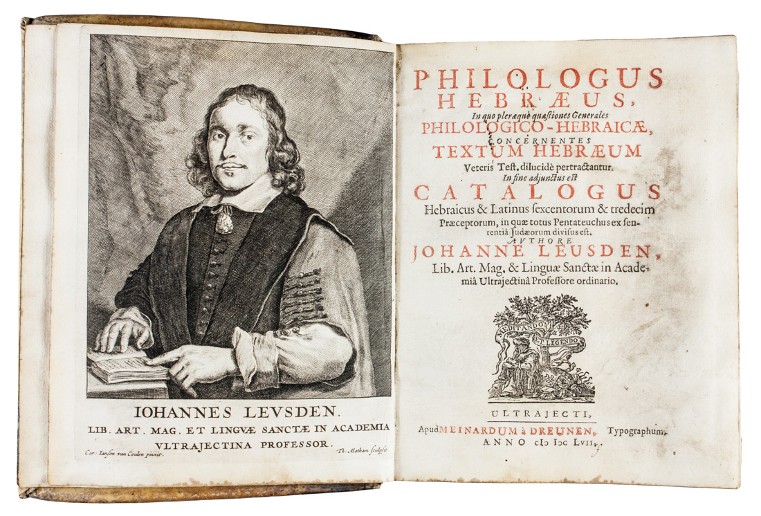 4 opere in 1 volume in-4° (mm193x155). Pagine [22], 447, [9] con 1 ritratto dell'Autore inciso in rame in antiporta da Theodorus Matham su disegno di Van Ceulen. Frontespizio stampato in rosso e nero con marca tipografica incisa in legno, capilettera e fregi xilografici. LEGATO CON: Id., Philologus Hebraeo-Graecus generalis [...] editio secunda... Lugduni Batavorum, Apud Jordanum Luchtmans, 1685. Pagine [16], 220, [10]. Frontespizio stampato in rosso e nero con marca dello stampatore. LEGATO CON: Id., Targūm ʿIvrī šel Danīʾel weʿEzrʾa sive Translatio Hebraica omnium textuum chaldaicorum. Lugduni Batavorum, Apud Jordanum Luchtmans, 1685. Pagine 48, [2]. LEGATO CON: Id., Philologus Hebraeo-Mixtus, unà cum spicilegio philologico [...] editio secunda... Ultrajecti: Ex officinâ Francisci Halma, 1682. Pagine [16], 463, [9] con 1 bella antiporta allegorica incisa da Jan van der Avelen e 8 tavole raffiguranti usi e costumi ebraici incise in rame fuori testo. esemplare con arrossature sparse e uno strappo riparabile a una carta ma bella copia. Legatura muta coeva in piena pergamena, con macchie e deformazione per effetto dell'umidità.