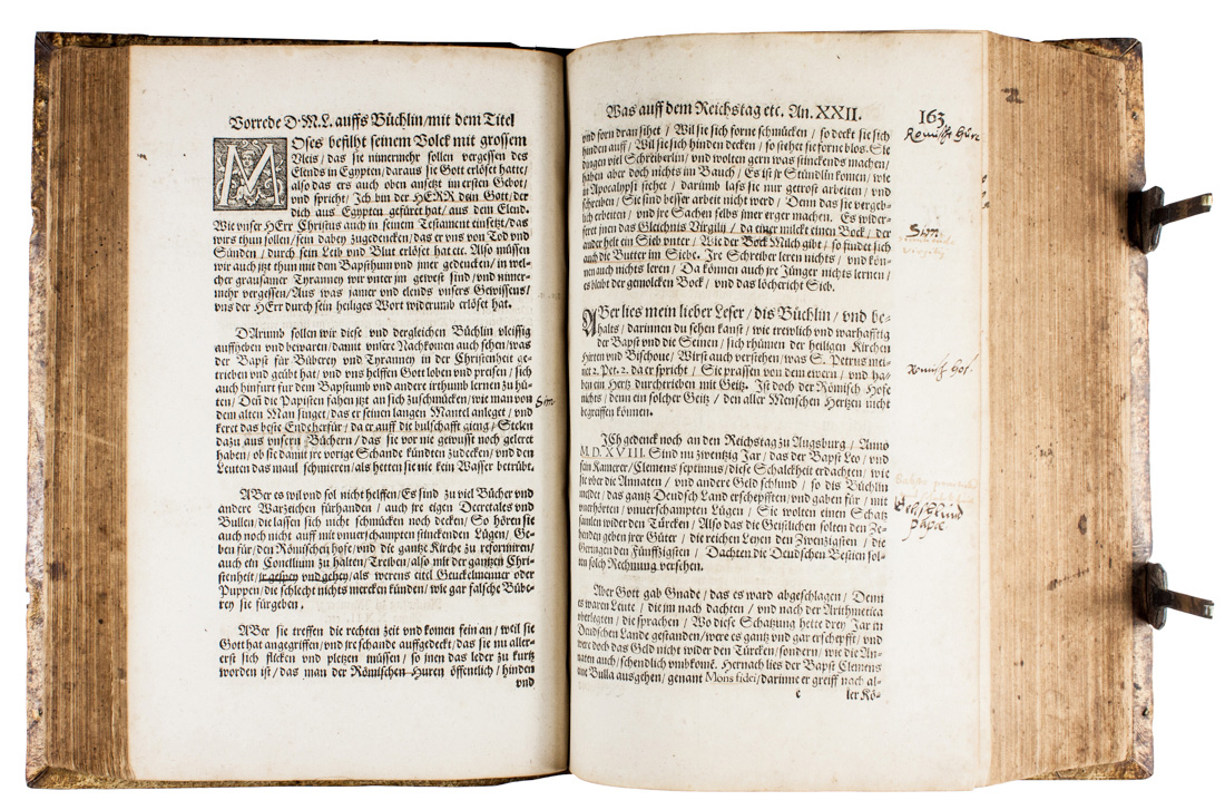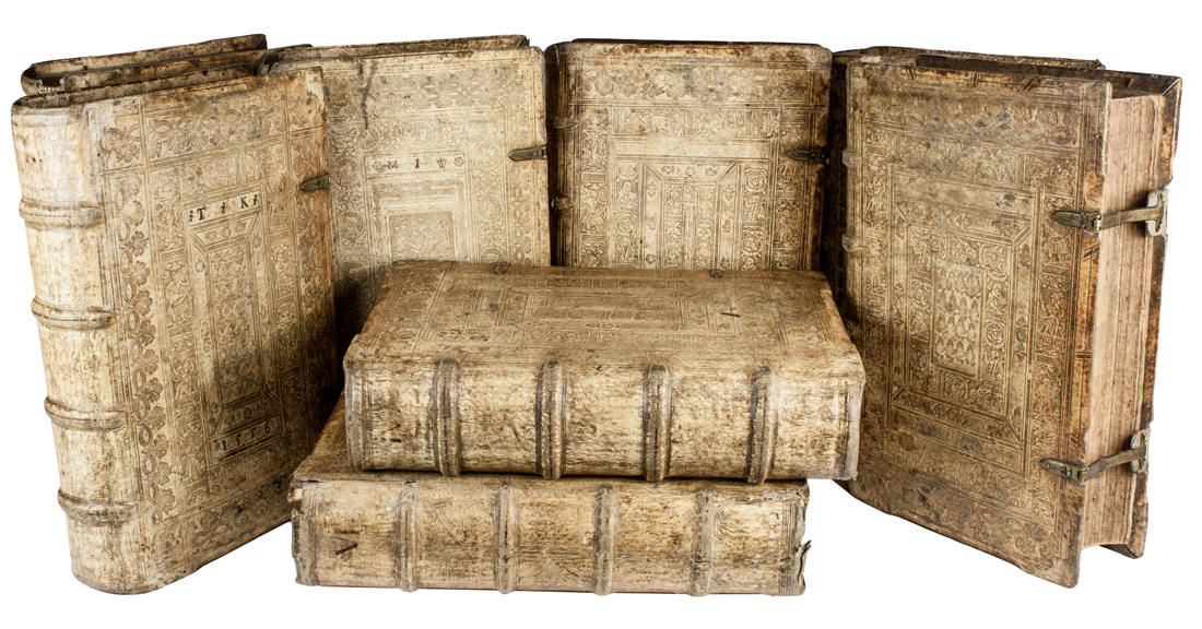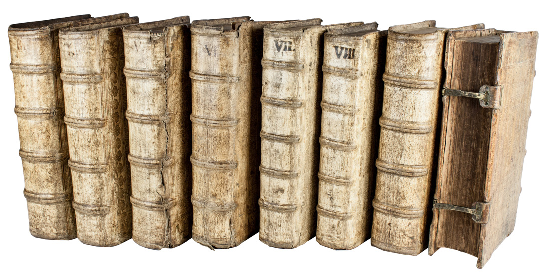 8 volumi in-folio (mm 318x202). Carte [12], 588 [i.e. 590], [4]; [6], 523, 1 bianca con 2 bei legni incisi a mezza pagina nel testo; [1], 577, [6] con 1 xilografia a mezza pagina nel testo; 579, [4], 1 bianca in fine con 1 illustrazione a piena pagina e 1 mappa del mondo a mezza pagina incise in legno nel testo; [6], 569, [3] di cui 2 bianche con 1 xilografia a piena pagina nel testo; [6], 546, [1] di errata con 1 xilografia a piena pagina nel testo; [4], 449 con 1 figura incisa in legno a piena pagina nel testo; [4], 391 con 1 legno inciso a piena pagina nel testo. Frontespizi in inchiostro rosso e nero con vignette xilografiche, identiche nei tomi primo, secondo e sesto. Arrossature sparse, dovute alla carta dell'epoca, più accentuate nel settimo volume, minimi strappetti riparabili in alcuni tomi, con perdita di poche lettere in una carta del primo, lievi gore d'acqua marginali ma esemplare completo e nel complesso in buono stato. Legature coeve simili in pelle di scrofa montata su assi di legno, con cornici concentriche di motivi floreali e personaggi biblici delineate da duplice filetto impresse a secco ai piatti e dorsi a quattro e cinque nervi; alcune delle legature recano monogrammi e date impressi a secco ai piatti, che non rispecchiano le date di stampa dei volumi. Fermagli conservati in cinque degli otto tomi. Un volume con dorso rovinato, forellini di tarlo, tracce di sporco e altre mende ma nel complesso belle. Note di possesso ai fogli di guardia e ai frontespizi, glosse manoscritte di due diverse mani cinquecentesca e seicentesca, fitte sottolineature.(8)