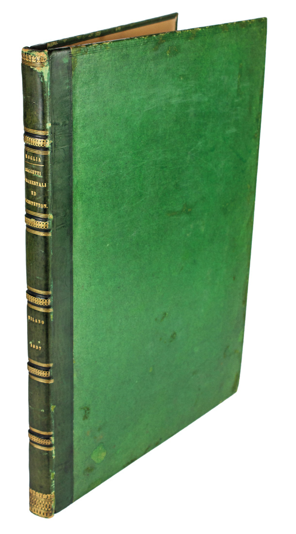 In-folio (mm 384x275). Pagine [10], [6] con 56 carte di tavole numerate incise in rame al tratto da Angelo Brusa, Luigi Bramati, Luigi Castellini e Gaetano Durelli su disegni dell'Autore. Frontespizio calcografico entro bella bordura alla greca. Fioriture sparse, più evidenti in principio ma ottima copia. Legatura coeva in mezza pelle verde con piatti in carta verde, titoli impressi in oro al dorso. Lievemente lisa. Lunga dedica manoscritta al Procuratore fiscale del Regno lombardo-veneto di mano dell'Autore al primo foglio bianco, conservata all'interno una tavola proveniente da altra opera incisa da Castellini su disegno di Moglia.
