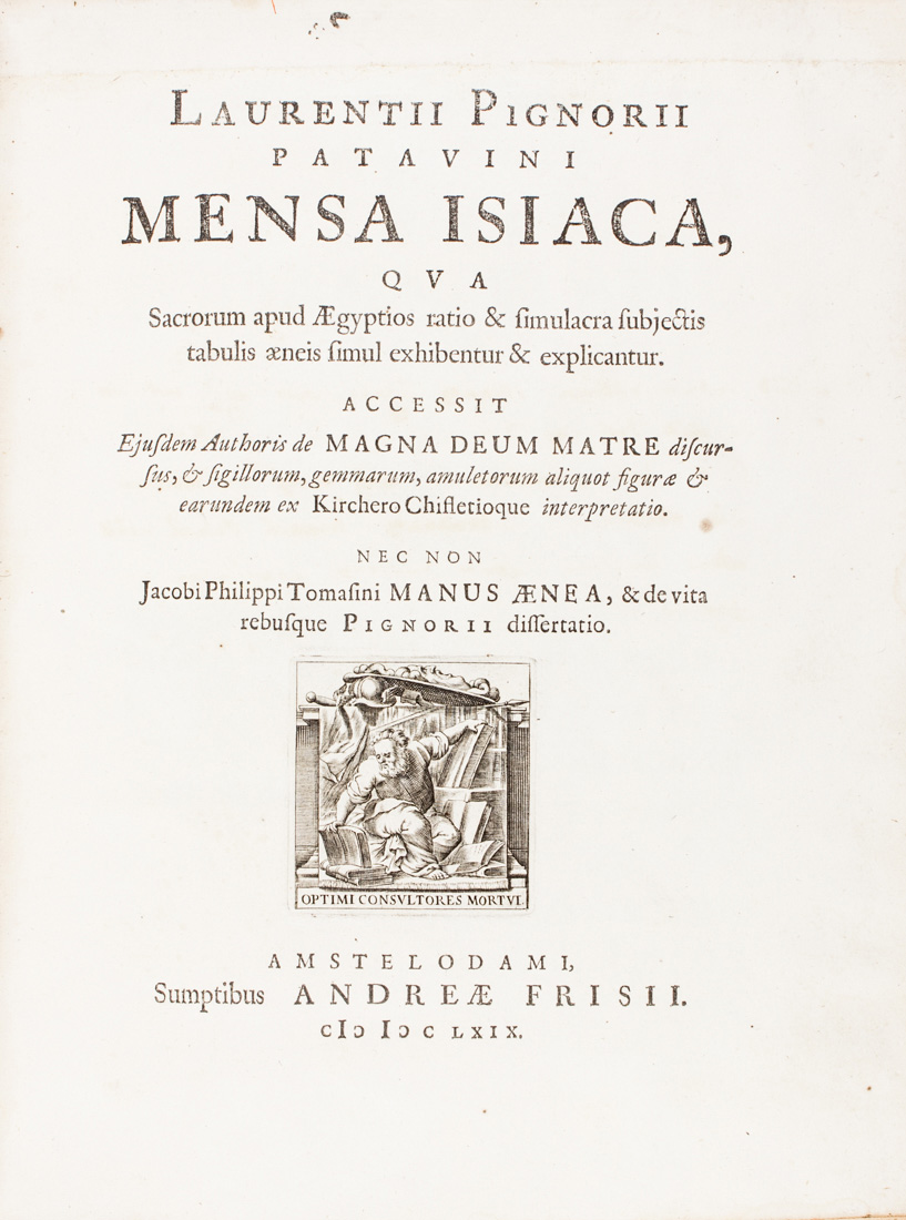 Pignoria Lorenzo, Mensa Isiaca, qua sacrorum apud Aegyptios ratio & simulacra subjectis tabulis aeneis simul exhibentur & explicantur...