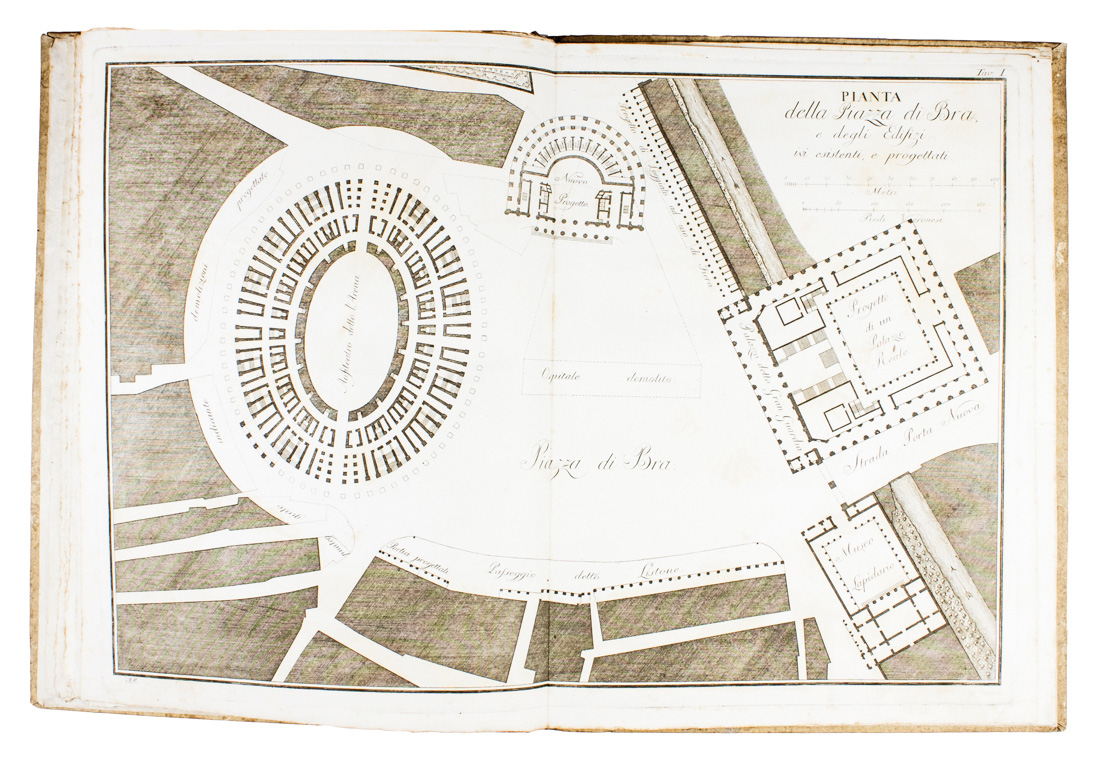 In-4° (mm 315x240). Pagine 24 con 5 tavole numerate disegnate e incise in rame da Ronzani, 2 delle quali a doppia pagina. Veduta calcografica incisa sempre da Ronzani al frontespizio. Fioriture sparse ma buon esemplare in barbe. Cartonato coevo con titoli manoscritti al dorso, con minimi difetti.