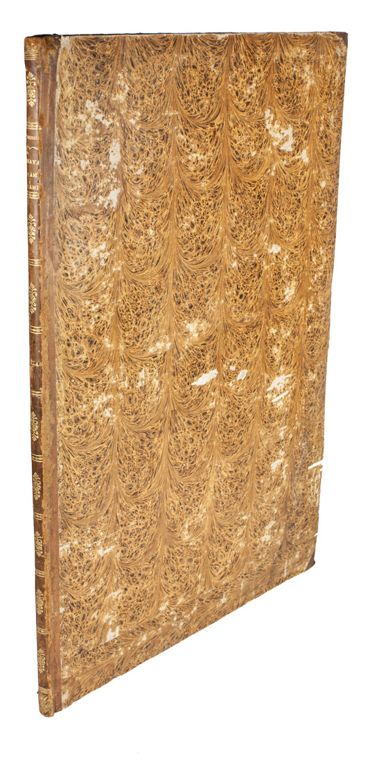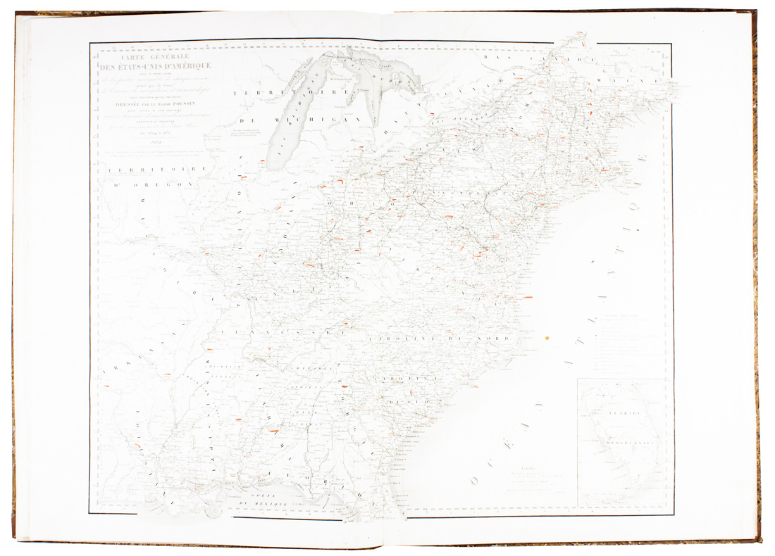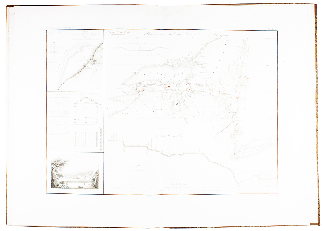 In-folio (mm 508x353). Pagine [4] con 10 tavole di piante e prospetti. Il solo volume dell'Atlas contenente 1 Carte générale des États-Unis e 9 tavole dei principali Canali americani. Ampie ma lavabili gore d'acqua lungo il volume, più evidenti nelle prime carte, e alcune sottolineature a matita nella mappa generale ma bella copia. Legatura coeva in mezza pelle con piatti marmorizzati e titoli impressi in oro al dorso; spellature ai piatti.