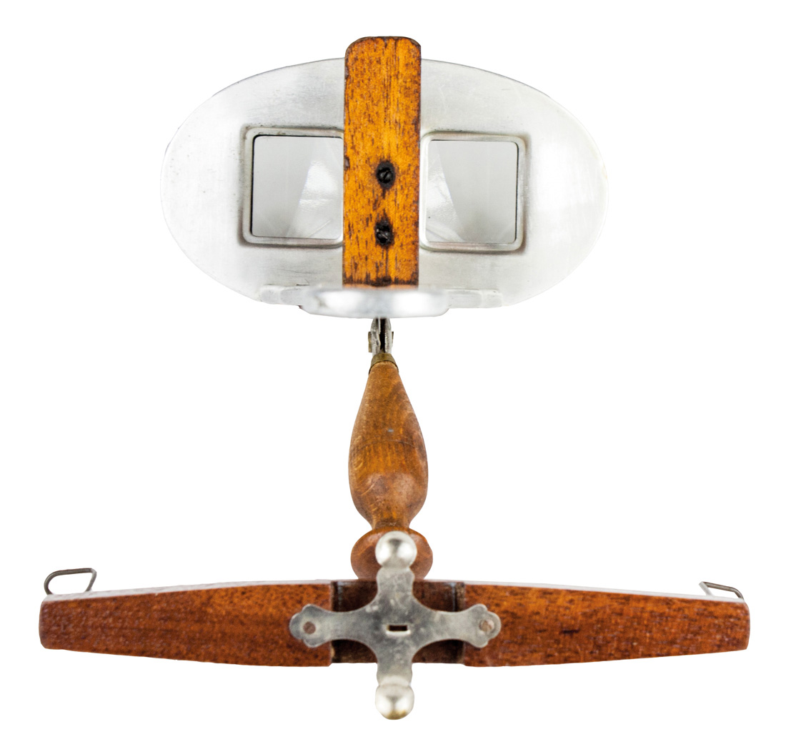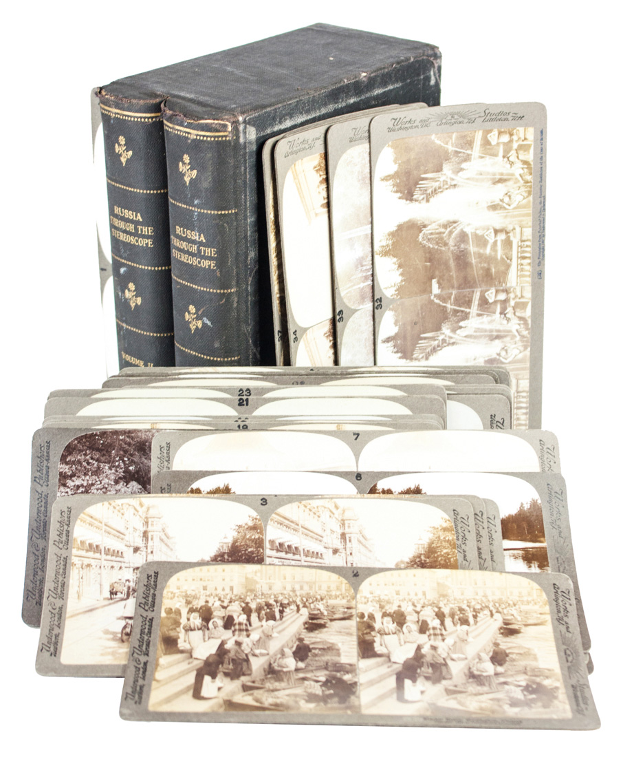 Stereoscopio originale dei primi anni del secolo scorso, completo di ogni singola parte originale e perfettamente funzionante insieme a 99 fotografie stereoscopiche (su 100, manca n. 69) numerate 1-100 e contenute in cofanetto dalla forma di tre volumi affiancati, con titoli in oro al dorso; minimi difetti al cofanetto. Le 99 fotografie della serie Russia through the stereoscope ritraggono monumenti, città, feste, parate, personaggi e uomini illustri della Russia dello Zar, dalla Finlandia fino al Mar Nero.(101)
