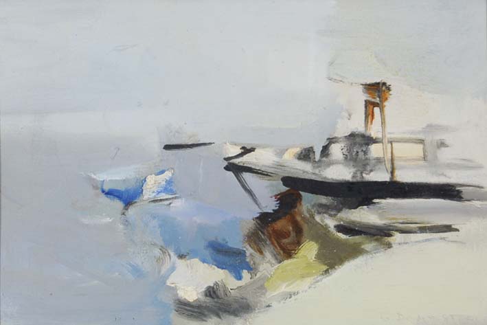 DOMESTICI GIAMPAOLO Venezia 1924 - 1999 Imbarcadero olio su cartone telato Misure: 20x30 firma in basso a destra dedica ad personam al retro esposizioni Galleria d'Arte Pro-Padova - timbro al retro