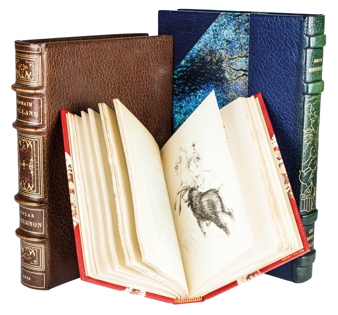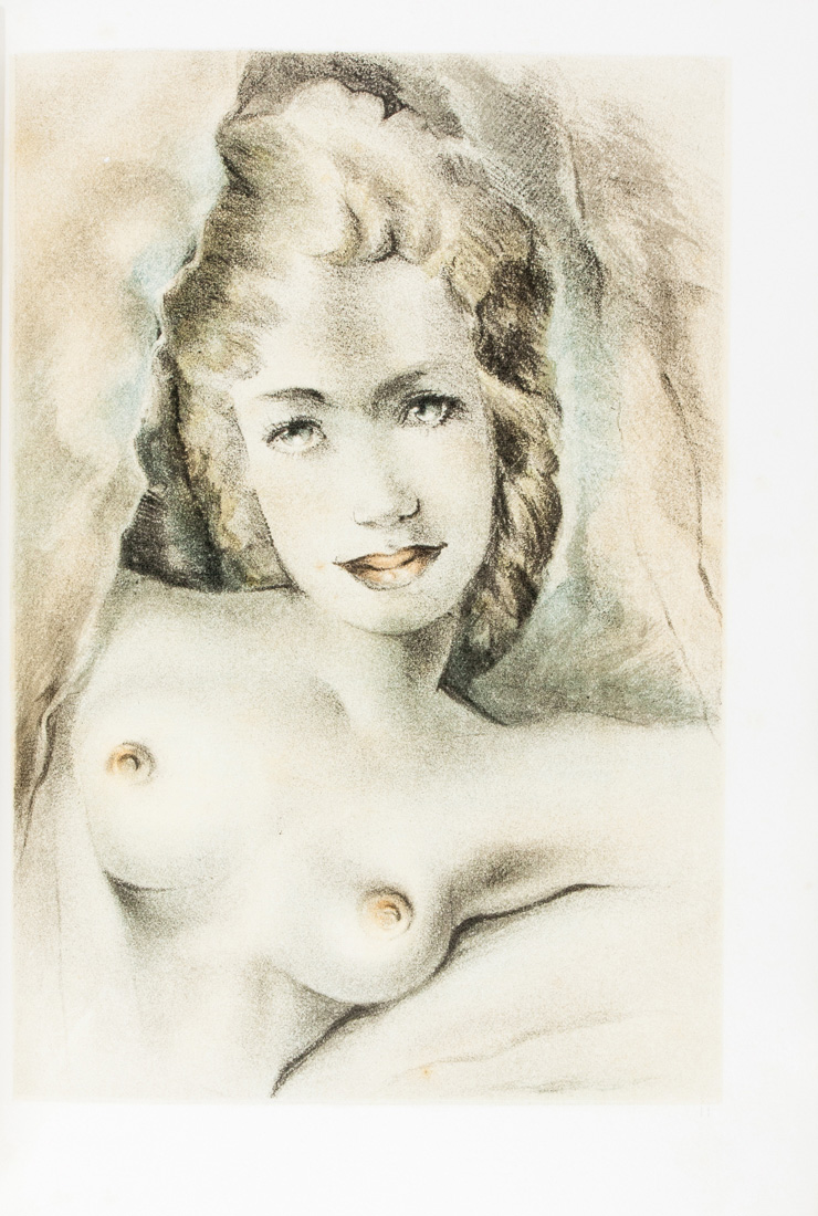 In-4° (mm 315x220). Pagine [12], 187, [9] con 12 litografie originali a colori di Mariette Lydis fuori testo. Esemplare n. 150, uno dei 350 su vélin de Rives di una tiratura limitata a 382 copie. Legatura in mezzo marocchino blu con punte, titoli e grazioso fregio raffigurante due fanciulle impressi in oro al dorso. Brossura editoriale all'interno. Custodia in cartonato. SI AGGIUNGE: Id., Les Bestiaires. Roman orné de six pointes sèches originales par Daragnès. Paris: Editions Grasset, 1938. SI AGGIUNGE: Rolland Romain, Colas Breugnon. «Bonhomme vit Encore». Lithographies originales de Théo van Elsen. Paris: Rousseau-Girard, 1946. (3)