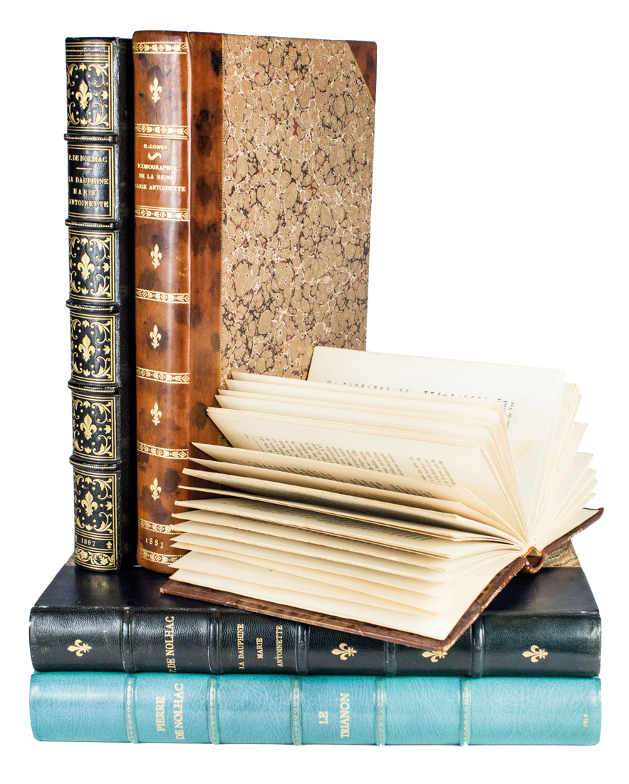 In-4° (mm 318x242). Pagine 171, [13] con 1 ritratto in antiporta finemente acquarellato a mano e 28 tavole fuori testo, di cui una a doppia pagina; veline protettive con didascalie stampate in rosso. Esemplare n. 935/1000. Qualche arrossatura sparsa, anche ampia, ma nel complesso buona copia. Legatura d'amatore in mezzo marocchino nero a grana media con angoli, titoli e fregi floreali impressi in oro al dorso. Brossura editoriale conservata all'interno. SI AGGIUNGE: Altra copia, in legatura d'amatore in mezzo marocchino nero con titoli dorati al dorso e brossura parimenti conservata, internamente senza difetti. SI AGGIUNGE: Id., Le Trianon de Marie-Antoinette. Paris: Goupil e Cie, 1914. In-folio (mm 320x245). Pagine [2], 182, [2] con 1 ritratto a colori in antiporta e 44 tavole fuori testo protette da veline con didascalie stampate in rosso. Esemplare n. XXV su una tiratura complessiva limitata a 75 copie su Japon, senza la suite delle tavole su carta Whatman. Legatura moderna in mezzo marocchino azzurro con punte e piatti marmorizzati. Brossura editoriale conservata all'interno. SI AGGIUNGE: Id., La Reine Marie-Antoinette. Paris: Calmann-Lévy, s.d. 1 volume in-8° in demi-chagrin marrone. SI AGGIUNGE: Gower Ronald, Iconographie de la Reine Marie-Antoinette... Paris: Quantin, 1883.(5)