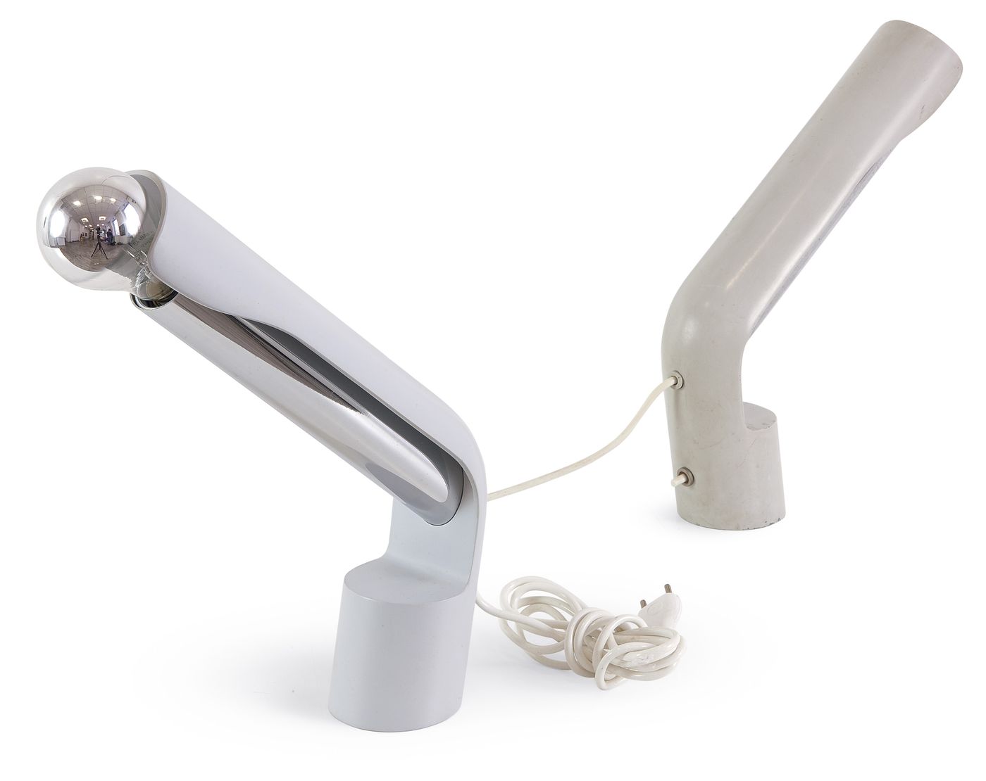 CARRUTHERS RICHARD – Pugno, Due lampade da tavolo. Base in fusione di metallo laccato grigio, sostegno portalampade in ottone cromato. Prod. Fontana Arte Studio. cm. 34x6. Bibl.: Interni La rivista dell’arredamento n° 52 apr. 1971, pubblicità.