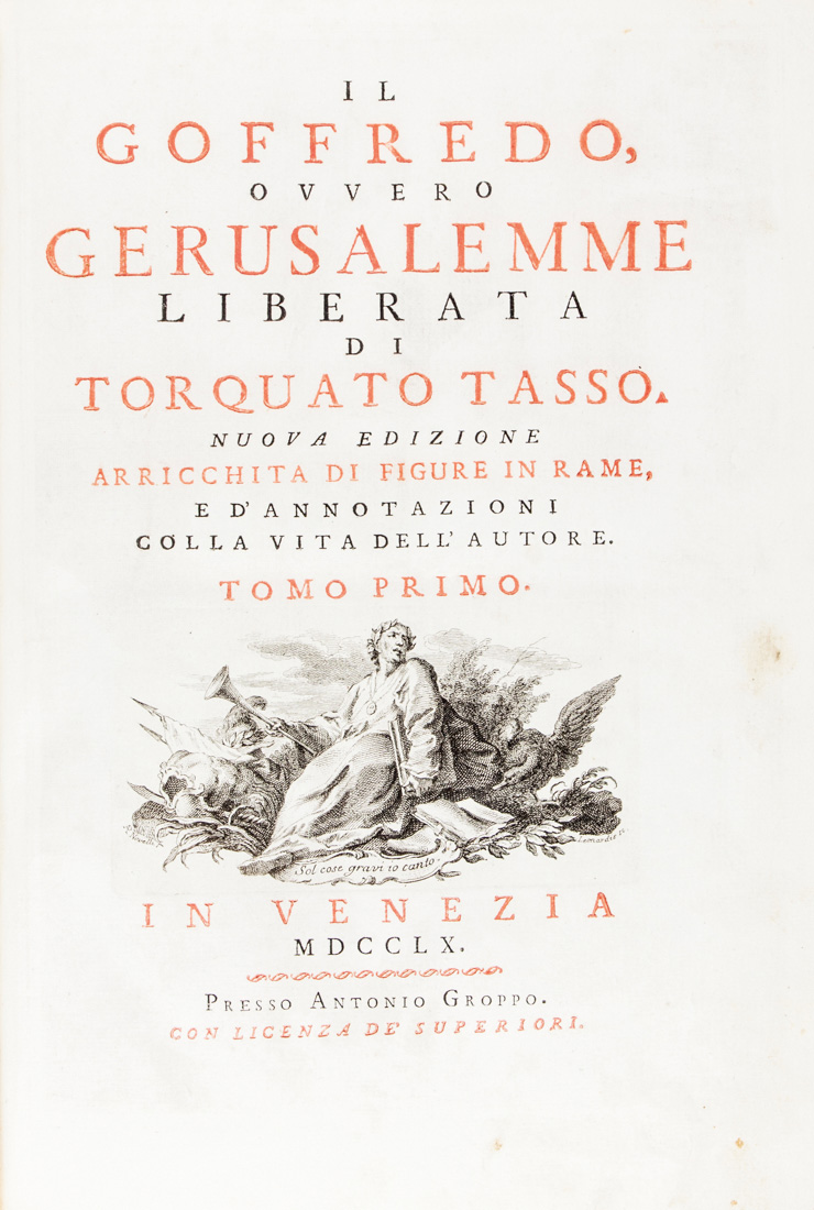 Tasso Torquato, Il Goffredo, ovvero Gerusalemme liberata [...]. Nuova edizione. Arricchita con figure in rame, e d'annotazioni con la vita dell'autore. Tomo primo (-secondo).